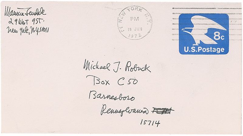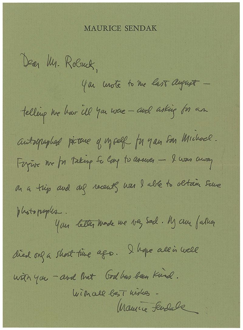 ALS, one page, 5 x 7, personal letterhead, January 19, 1972. Response to an autograph request. In full: “You wrote to me last August—telling me how sick you were—and asking for an autographed picture of myself for your son Michael. Forgive me for taking so long—I was away on a trip and only recently was I able to obtain some photographs. Your letter made me very sad. My own father died only a short time ago. I hope all is well with you—and that God has been kind.” In fine condition. Accompanied by the original mailing envelope addressed in Sendak’s hand, including a signature in the return address area.