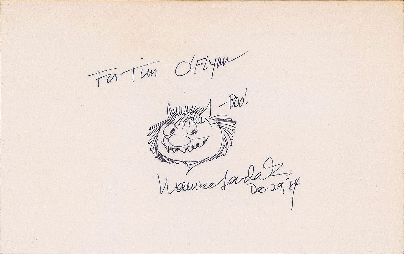 Original felt tip sketch of Carol from Where the Wild Things Are, saying "Boo!," accomplished by Sendak on an off-white 8 x 5 card, signed and inscribed in black felt tip, "For Tim O'Flynn, Maurice Sendak, Dec-29, '84." In fine condition, with light edge toning.