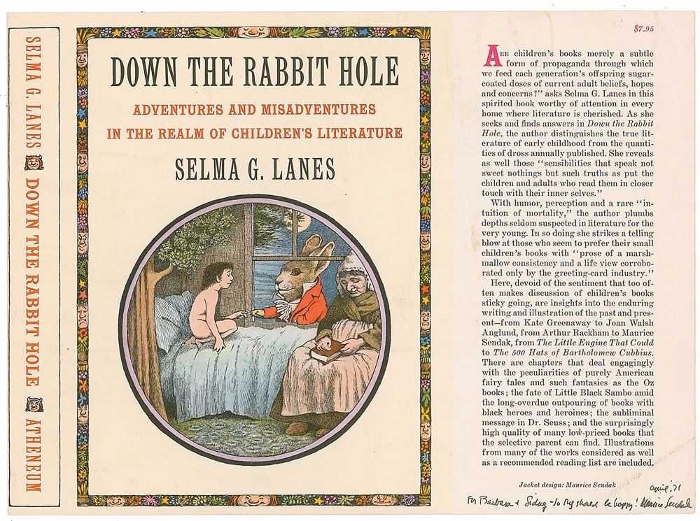 Dust jacket proof for Down the Rabbit Hole, 23 x 8.75, signed and inscribed in black ink in the lower right corner, "April '71, For Barbara & Sidney—So Reg should be happy! Maurice Sendak." Folded at one edge of the spine. In fine condition.