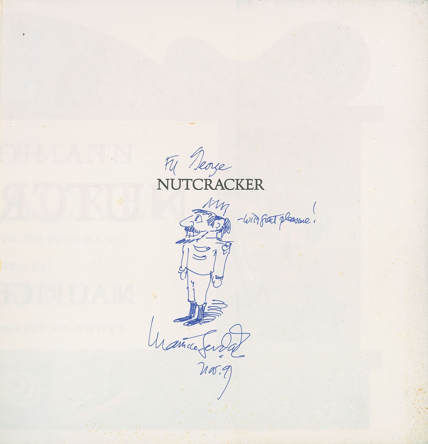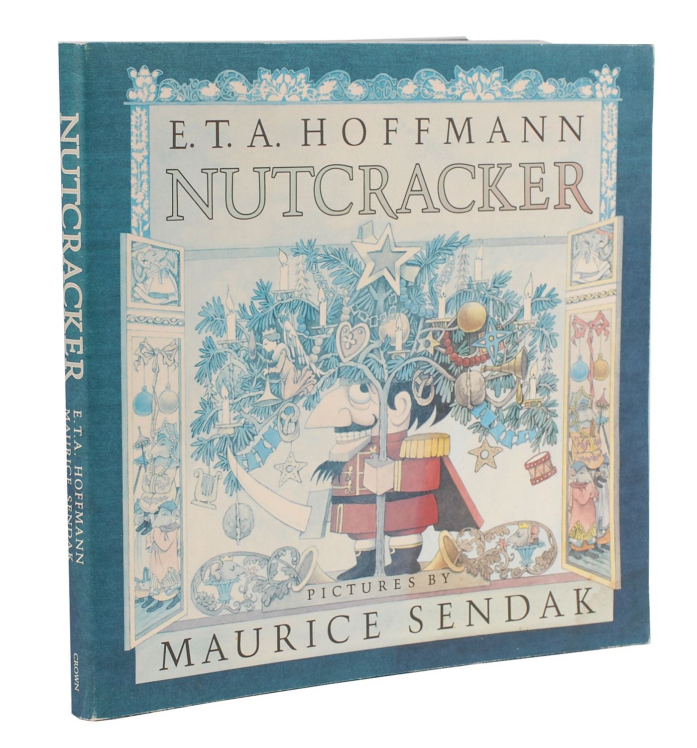 Signed book: Nutcracker. Sixth printing. NY: Crown Publishers, 1984. Softcover with dust jacket, 10 x 9.75, 102 pages. Signed and inscribed on the title page in blue ink, "For George, Maurice Sendak, Nov. 9," with the addition of a sketch of a small talking nutcracker, which says, "With great pleasure!" Scattered foxing to signed page and an area of dampstaining to lower right corner of dust jacket, otherwise fine condition. The book is inscribed to George Christy, a renowned gossip columnist for the Hollywood Reporter for over 25 years.