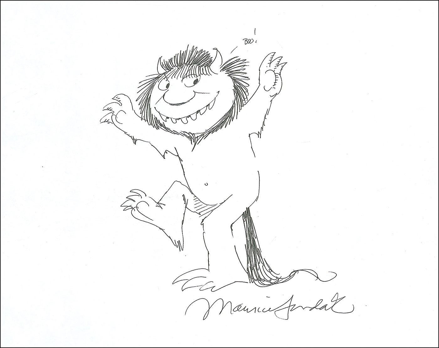 Original ink sketch by Sendak of Carol from Where the Wild Things Are on a white 10 x 8 piece of heavy cardstock, signed below by Sendak. In very fine condition.