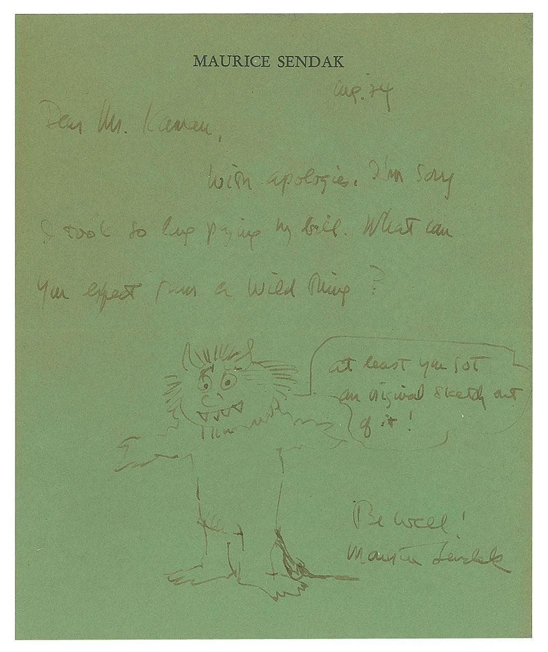 ALS, one page, 5.25 x 6.5, personal letterhead, August 1947. Short letter to his Greenwich Village dry cleaner, in full: "With apologies. I'm sorry I took so long paying my bill. What can you expect from a Wild Thing?" On the lower half of the sheet, Sendak adds a full-length sketch of Carol the wild thing, with a speech balloon reading, "At least you got an original sketch out of it!" In fine condition, with text and sketch uniformly lightly faded, but still completely legible. Sendak sketches of any of his characters are rather uncommon, even more so from his most famous work.