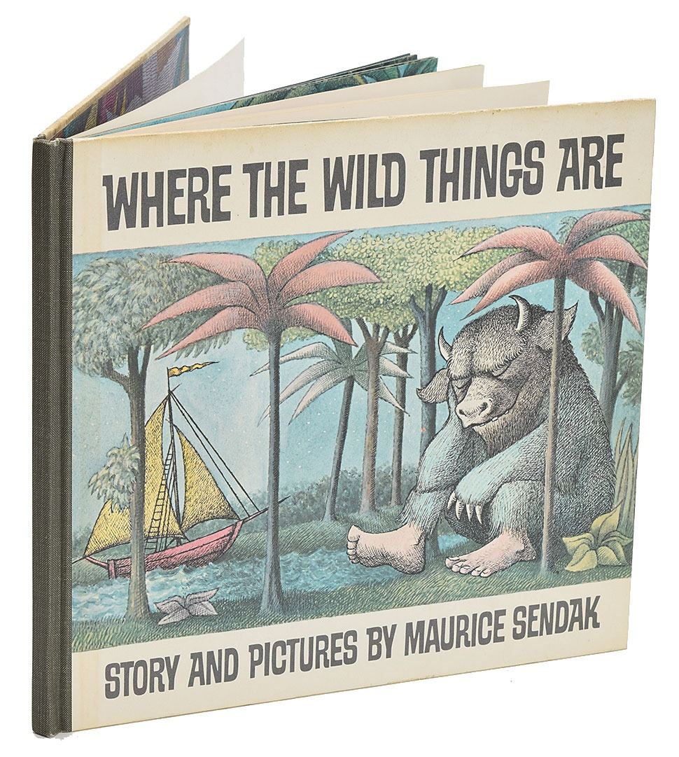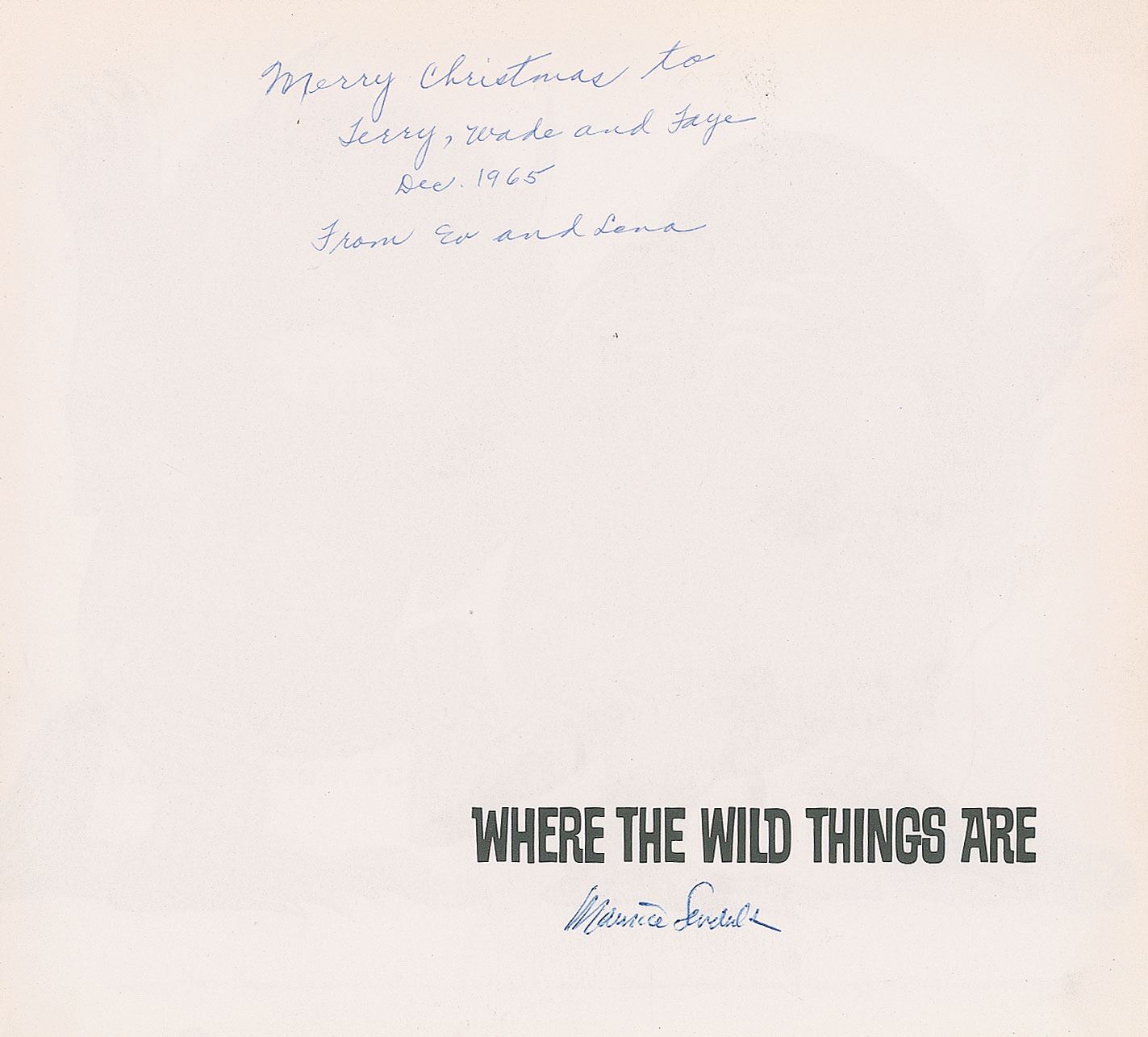 Signed book: Where the Wild Things Are. First edition, with "Library of Congress catalog card number: 63-21253" on title page. NY: Harper & Row, Publishers, 1963. Hardcover, 10.25 x 9.25. Signed on the half-title page in blue ballpoint, "Maurice Sendak." Autographic condition: fine, with a gift inscription at the top of the page in an unknown hand. Book condition: VG+/None, with light toning to edges.