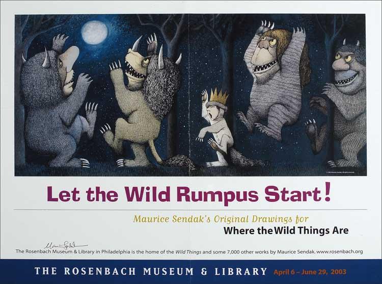 Color 24 x 18 poster entitled for a 2003 exhibition of Sendak’s work for Where the Wild Things Are, signed in black ink. In fine condition, with a heavy bisecting vertical fold. RRAuction COA.
