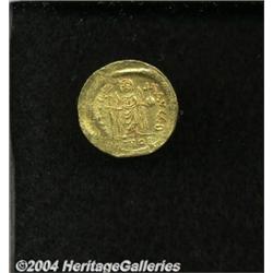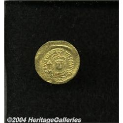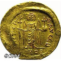 <B>Maurice Tiberius.</B></I> A.D. 582-602. AV solidus (22 mm, 4.45 g). Constantinople, A.D. 583-601. Helmeted and cuirassed facing bust, holding globus cruciger / Angel standing facing, holding long P-headed cross and globus cruciger; B/CONOB. DOC 5b; SB 478. Good VF. <BR><I>From the Geneva Collection.</B></I> <BR><BR><B>Important notice:</B> Heritage usually auctions material at the rate of 200-250 lots per hour. On some occasions eBay Live bid software or the Internet may not be able to keep up with the pace of the auction. We recommend placing a realistic absentee bid now as insurance to avoid disappointment. Occasionally the auctioneer may eliminate or reject an eBay Live bid, and the auctioneer may also reopen a lot after the close of the eBay live bidding (usually because we missed an audience bid), and may reject your bid even if it shows you as the winning bidder. By bidding via eBay Live, you agree that Heritage may award the lot to another bidder at its sole discretion under the circumstances described above or any other reasonable circumstances. Since eBay bids are not shown to us until we open the lot on the floor, we treat those bids just like floor bids. In most cases the floor responds before the eBay bid is presented to us, due to Internet lag time, so for consistency we have made it a policy that floor bids are always considered first over tie eBay live bids. Also please note that all Heritage lots purchased through eBay Live carry a 20% Buyer's Premium. Please make sure you read the Terms and Conditions before you bid.