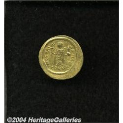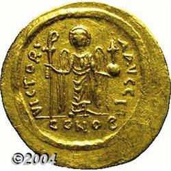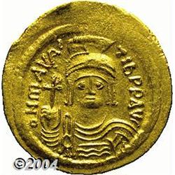 <B>Maurice Tiberius.</B></I> A.D. 582-602. AV solidus (21 mm, 4.36 g). Constantinople, A.D. 583-601. Helmeted and cuirassed facing bust, holding globus cruciger / Angel standing facing, holding long P-headed cross and globus cruciger; (Gamma)/CONOB. DOC 5c; SB 478. Good VF. <BR><I>From the Geneva Collection.</B></I> <BR><BR><B>Important notice:</B> Heritage usually auctions material at the rate of 200-250 lots per hour. On some occasions eBay Live bid software or the Internet may not be able to keep up with the pace of the auction. We recommend placing a realistic absentee bid now as insurance to avoid disappointment. Occasionally the auctioneer may eliminate or reject an eBay Live bid, and the auctioneer may also reopen a lot after the close of the eBay live bidding (usually because we missed an audience bid), and may reject your bid even if it shows you as the winning bidder. By bidding via eBay Live, you agree that Heritage may award the lot to another bidder at its sole discretion under the circumstances described above or any other reasonable circumstances. Since eBay bids are not shown to us until we open the lot on the floor, we treat those bids just like floor bids. In most cases the floor responds before the eBay bid is presented to us, due to Internet lag time, so for consistency we have made it a policy that floor bids are always considered first over tie eBay live bids. Also please note that all Heritage lots purchased through eBay Live carry a 20% Buyer's Premium. Please make sure you read the Terms and Conditions before you bid.