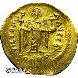 <B>Maurice Tiberius.</B></I> A.D. 582-602. AV solidus (21 mm, 4.39 g). Constantinople, A.D. 583-601. Helmeted and cuirassed facing bust, holding globus cruciger / Angel standing facing, holding long P-headed cross and globus cruciger; S/CONOB. DOC 5f; SB 478. Nice VF. <BR><I>From the Geneva Collection.</B></I> <BR><BR><B>Important notice:</B> Heritage usually auctions material at the rate of 200-250 lots per hour. On some occasions eBay Live bid software or the Internet may not be able to keep up with the pace of the auction. We recommend placing a realistic absentee bid now as insurance to avoid disappointment. Occasionally the auctioneer may eliminate or reject an eBay Live bid, and the auctioneer may also reopen a lot after the close of the eBay live bidding (usually because we missed an audience bid), and may reject your bid even if it shows you as the winning bidder. By bidding via eBay Live, you agree that Heritage may award the lot to another bidder at its sole discretion under the circumstances described above or any other reasonable circumstances. Since eBay bids are not shown to us until we open the lot on the floor, we treat those bids just like floor bids. In most cases the floor responds before the eBay bid is presented to us, due to Internet lag time, so for consistency we have made it a policy that floor bids are always considered first over tie eBay live bids. Also please note that all Heritage lots purchased through eBay Live carry a 20% Buyer's Premium. Please make sure you read the Terms and Conditions before you bid.