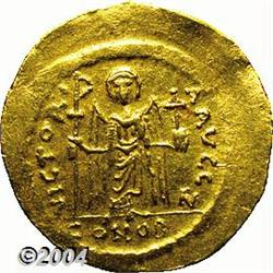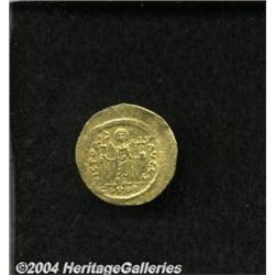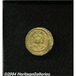 <B>Maurice Tiberius.</B></I> A.D. 582-602. AV solidus (22 mm, 4.42 g). Constantinople, A.D. 583-601. Helmeted and cuirassed facing bust, holding globus cruciger / Angel standing facing, holding long P-headed cross and globus cruciger; Z/CONOB. DOC 5g; SB 478. Good VF. <BR><I>From the Geneva Collection.</B></I> <BR><BR><B>Important notice:</B> Heritage usually auctions material at the rate of 200-250 lots per hour. On some occasions eBay Live bid software or the Internet may not be able to keep up with the pace of the auction. We recommend placing a realistic absentee bid now as insurance to avoid disappointment. Occasionally the auctioneer may eliminate or reject an eBay Live bid, and the auctioneer may also reopen a lot after the close of the eBay live bidding (usually because we missed an audience bid), and may reject your bid even if it shows you as the winning bidder. By bidding via eBay Live, you agree that Heritage may award the lot to another bidder at its sole discretion under the circumstances described above or any other reasonable circumstances. Since eBay bids are not shown to us until we open the lot on the floor, we treat those bids just like floor bids. In most cases the floor responds before the eBay bid is presented to us, due to Internet lag time, so for consistency we have made it a policy that floor bids are always considered first over tie eBay live bids. Also please note that all Heritage lots purchased through eBay Live carry a 20% Buyer's Premium. Please make sure you read the Terms and Conditions before you bid.