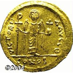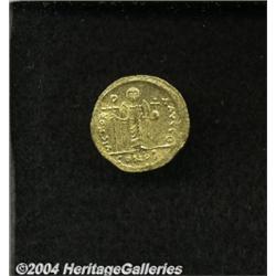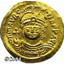 <B>Maurice Tiberius.</B></I> A.D. 582-602. AV solidus (22 mm, 4.45 g). Constantinople, A.D. 583-601. Helmeted and cuirassed facing bust, holding globus cruciger / Angel standing facing, holding long P-headed cross and globus cruciger; (Theta)/CONOB. DOC 5i; SB 478. XF. <BR><I>From the Geneva Collection.</B></I> <BR><BR><B>Important notice:</B> Heritage usually auctions material at the rate of 200-250 lots per hour. On some occasions eBay Live bid software or the Internet may not be able to keep up with the pace of the auction. We recommend placing a realistic absentee bid now as insurance to avoid disappointment. Occasionally the auctioneer may eliminate or reject an eBay Live bid, and the auctioneer may also reopen a lot after the close of the eBay live bidding (usually because we missed an audience bid), and may reject your bid even if it shows you as the winning bidder. By bidding via eBay Live, you agree that Heritage may award the lot to another bidder at its sole discretion under the circumstances described above or any other reasonable circumstances. Since eBay bids are not shown to us until we open the lot on the floor, we treat those bids just like floor bids. In most cases the floor responds before the eBay bid is presented to us, due to Internet lag time, so for consistency we have made it a policy that floor bids are always considered first over tie eBay live bids. Also please note that all Heritage lots purchased through eBay Live carry a 20% Buyer's Premium. Please make sure you read the Terms and Conditions before you bid.