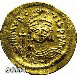 <B>Maurice Tiberius.</B></I> A.D. 582-602. AV solidus (21 mm, 4.48 g). Constantinople, A.D. 583-601. Helmeted and cuirassed facing bust, holding globus cruciger / Angel standing facing, holding long P-headed cross and globus cruciger; I/CONOB. DOC 5j; SB 478. VF. <BR><I>From the Geneva Collection.</B></I> <BR><BR><B>Important notice:</B> Heritage usually auctions material at the rate of 200-250 lots per hour. On some occasions eBay Live bid software or the Internet may not be able to keep up with the pace of the auction. We recommend placing a realistic absentee bid now as insurance to avoid disappointment. Occasionally the auctioneer may eliminate or reject an eBay Live bid, and the auctioneer may also reopen a lot after the close of the eBay live bidding (usually because we missed an audience bid), and may reject your bid even if it shows you as the winning bidder. By bidding via eBay Live, you agree that Heritage may award the lot to another bidder at its sole discretion under the circumstances described above or any other reasonable circumstances. Since eBay bids are not shown to us until we open the lot on the floor, we treat those bids just like floor bids. In most cases the floor responds before the eBay bid is presented to us, due to Internet lag time, so for consistency we have made it a policy that floor bids are always considered first over tie eBay live bids. Also please note that all Heritage lots purchased through eBay Live carry a 20% Buyer's Premium. Please make sure you read the Terms and Conditions before you bid.