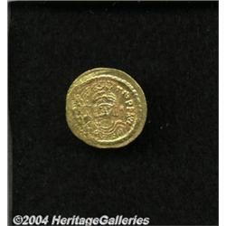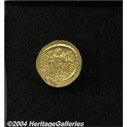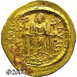 <B>Maurice Tiberius.</B></I> A.D. 582-602. AV light weight solidus (21 mm, 4.32 g). Constantinople, A.D. 583-601. Helmeted and cuirassed facing bust, holding globus cruciger / Angel standing facing, holding long P-headed cross and globus cruciger; star in right field; I/[CONOB]. DOC 7i; SB 481. Good VF, crude strike. <BR><I>From the Geneva Collection.</B></I> <BR><BR><B>Important notice:</B> Heritage usually auctions material at the rate of 200-250 lots per hour. On some occasions eBay Live bid software or the Internet may not be able to keep up with the pace of the auction. We recommend placing a realistic absentee bid now as insurance to avoid disappointment. Occasionally the auctioneer may eliminate or reject an eBay Live bid, and the auctioneer may also reopen a lot after the close of the eBay live bidding (usually because we missed an audience bid), and may reject your bid even if it shows you as the winning bidder. By bidding via eBay Live, you agree that Heritage may award the lot to another bidder at its sole discretion under the circumstances described above or any other reasonable circumstances. Since eBay bids are not shown to us until we open the lot on the floor, we treat those bids just like floor bids. In most cases the floor responds before the eBay bid is presented to us, due to Internet lag time, so for consistency we have made it a policy that floor bids are always considered first over tie eBay live bids. Also please note that all Heritage lots purchased through eBay Live carry a 20% Buyer's Premium. Please make sure you read the Terms and Conditions before you bid.