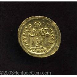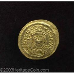 <TABLE cellSpacing=0 cellPadding=0 width="100%" bgColor=#000000 border=0><TBODY> <TR><TD width="100%"><TABLE cellSpacing=1 cellPadding=3 width="100%" border=0><TBODY><TR><TD width="100%" bgColor=#79735c><FONT face=arial color=#ffffff size=3><B>Description</B> </FONT></TD></TR><TR><TD width="100%" bgColor=#ffffff><FONT face=arial size=2><B>Maurice Tiberius.</B></I> A.D. 582-602. AV solidus (21 mm, 4.51 g). Constantinople, A.D. 583-601. Diademed, cuirassed bust facing, wearing plumed helmet, holding globus cruciger and shield / Angel standing facing, holding long staff surmounted by a Christogram in right hand, globus cruciger in left; B/CONOB. DOC 5b; SB 478. Good VF, probably ex jewelry. </FONT></TD></TR></TBODY></TABLE></TD></TR></TBODY></TABLE><BR><A name=PricesRealized></A><TABLE cellSpacing=0 cellPadding=0 width="100%" bgColor=#000000 border=0><TBODY><TR><TD width="100%"><TABLE cellSpacing=1 cellPadding=3 width="100%" border=0><TBODY><TR><TD width="100%" bgColor=#79735c><A name=PR><FONT face=arial color=#ffffff size=3><B>Previous Prices from Heritage Auctions</B> </FONT></A></TD></TR><TR><TD bgColor=#f6f6ed>No Prior Data Recorded </TD></TR><TR><TD bgColor=#ffffff><FONT face=arial size=1 ?>PLEASE NOTE: All prices realized reflect the final hammer price PLUS the buyer's premium in auctions that charge a buyer's premium. Each item has a notation at the top of the listing indicating whether that lot included a buyer's premium. Example: A item that sells with a final hammer price of $100 and a 20% buyer's premium will display with a price realized of $120. All information listed is intended to be as accurate as possible, but errors are possible. Please use this guide carefully and inform us of any inaccuracies. </FONT></TD></TR></TBODY></TABLE></TD></TR></TBODY></TABLE><BR><TABLE cellSpacing=0 cellPadding=0 width="100%" bgColor=#000000 border=0><TBODY><TR><TD width="100%"><TABLE cellSpacing=1 cellPadding=3 width="100%" border=0><TBODY><TR><TD width="100%" bgColor=#79735c colSpan=6><FONT face=arial color=#ffffff size=3><B>Price Guide*</B> </FONT></TD></TR><TR bgColor=#f6f6ed><TD align=middle><B>Grade</B> </TD><TD align=middle><B>Coin World<BR>(Trends)</B> </TD><TD align=middle><B>Numismedia<BR>Retail</B> </TD><TD align=middle><B>Numismedia<BR>Wholesale</B> </TD><TD align=middle><B>Coin<BR>Universe</B> </TD><TD align=middle><B>Heritage<BR>Value Index</B> </TD></TR><TR bgColor=#ffffff><TD colSpan=6><FONT size=1>*All information listed is intended to be as accurate as possible, but errors are possible. No item may be returned or refused based on this information which is provided as a service to our customers. You should contact each pricing source directly to determine the accuracy of this information. </FONT></TD></TR></TBODY></TABLE></TD></TR></TBODY></TABLE><BR><TABLE cellSpacing=0 cellPadding=0 width="100%" bgColor=#000000 border=0><TBODY><TR><TD width="100%"><TABLE cellSpacing=1 cellPadding=3 width="100%" border=0><TBODY><TR><TD width="100%" bgColor=#79735c><FONT face=arial color=#ffffff size=3><B>Population Guide</B> </FONT></TD></TR><TR bgColor=#ffffff> Important notice: Heritage usually auctions material at the rate of 200-250 lots per hour. On some occasions eBay Live bid software or the Internet may not be able to keep up with the pace of the auction. We recommend placing a realistic absentee bid now as insurance to avoid disappointment. Occasionally the auctioneer may eliminate or reject an eBay Live bid, and the auctioneer may also reopen a lot after the close of the eBay live bidding (usually because we missed an audience bid), and may reject your bid even if it shows you as the winning bidder. By bidding via eBay Live, you agree that Heritage may award the lot to another bidder at its sole discretion under the circumstances described above or any other reasonable circumstances. Also please note that all Heritage lots purchased through eBay Live carry a 20% Buyer's Premium. Please make sure you read the Terms and Conditions before you bid.</TD></TR></TBODY></TABLE></TD></TR></TBODY></TABLE>
