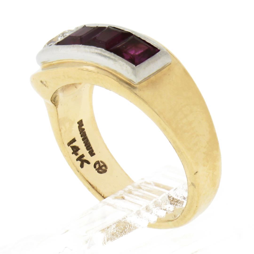 A vintage solid 14k yellow gold & platinum ring, with 1 old transitional cut natural diamnod (F - VS1 ; 0.27ct), and 3 square step cut natural rubies (0.60ctw). The ring is size 3.0, weighs a total of 5.08 grams, and measures 7.8mm wide.