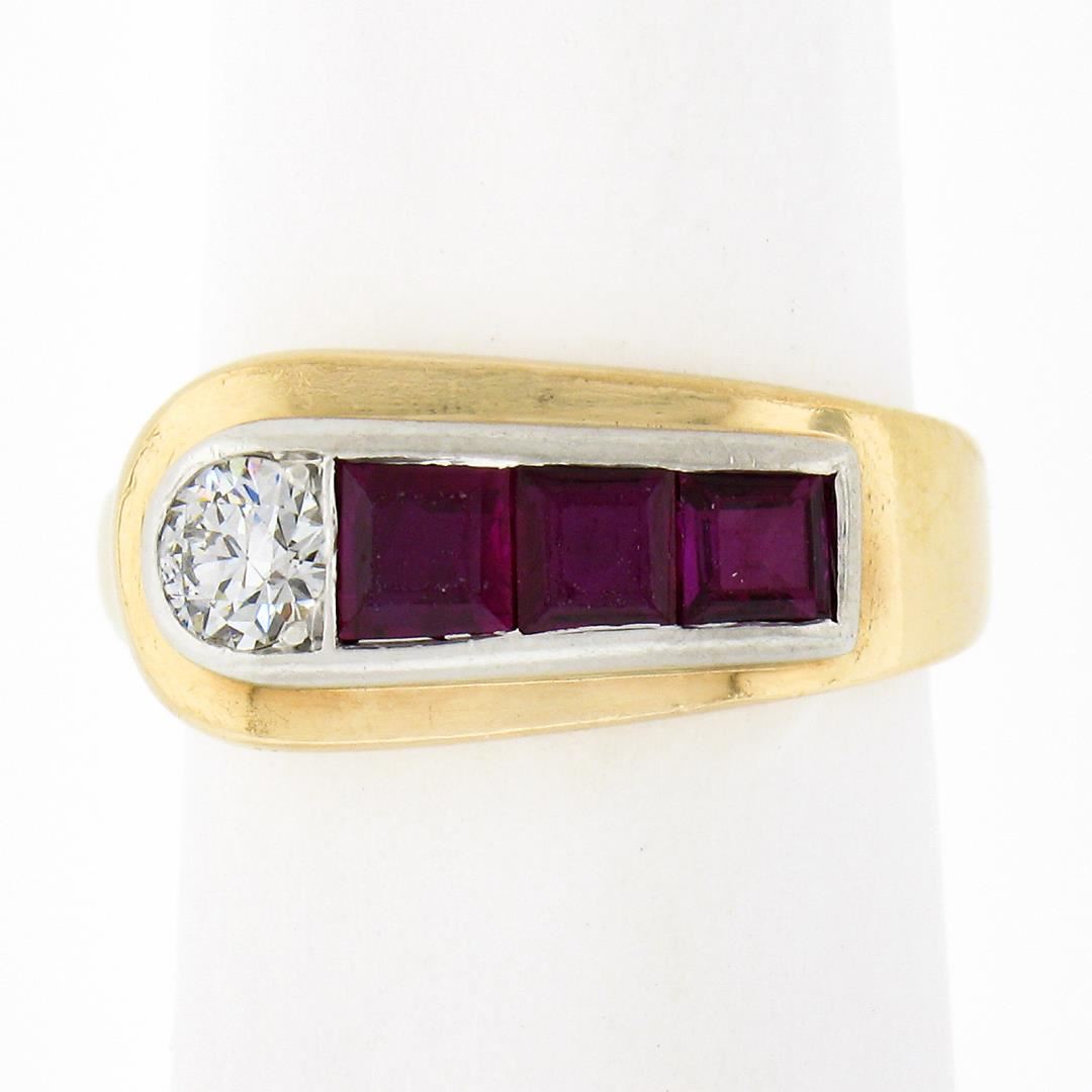 A vintage solid 14k yellow gold & platinum ring, with 1 old transitional cut natural diamnod (F - VS1 ; 0.27ct), and 3 square step cut natural rubies (0.60ctw). The ring is size 3.0, weighs a total of 5.08 grams, and measures 7.8mm wide.