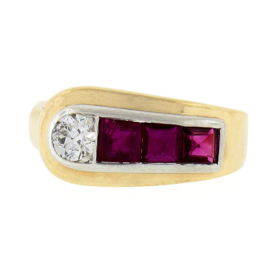 A vintage solid 14k yellow gold & platinum ring, with 1 old transitional cut natural diamnod (F - VS1 ; 0.27ct), and 3 square step cut natural rubies (0.60ctw). The ring is size 3.0, weighs a total of 5.08 grams, and measures 7.8mm wide.