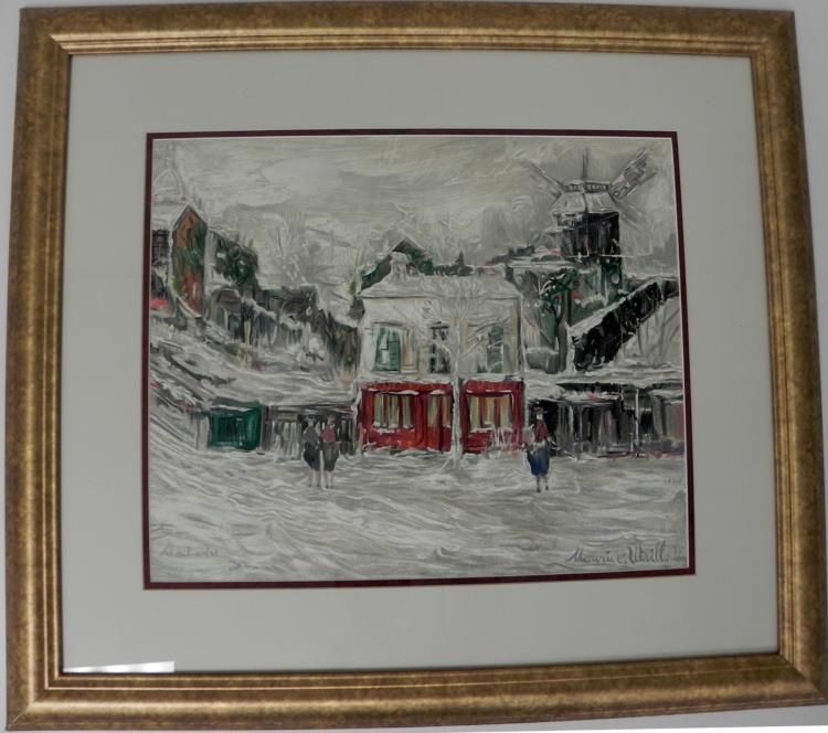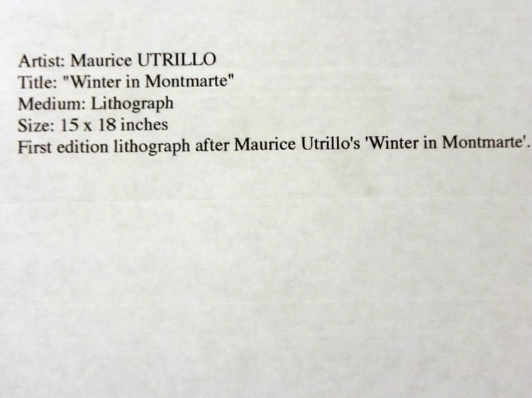 Artist: Maurice UtrilloTitle: Winter in MontmarteMedium: LithographSignature: In pencil, lower rightImage size: 15" x 18"Frame size: 24 3/4" x 27 1/2"Condition: Very good**According to the publisher, this is a first edition lithograph done after Maurice Utrillo's "Winter in Montmarte"BiographyMaurice Utrillo was born on Christmas Day in 1883. He was the son of the artist Suzanne Valadon (born Marie-Clémentine Valadon), who was then an eighteen-year-old artist's model. She never revealed who had been the father of her child; speculation exists that he was the offspring from a liaison with an equally young amateur painter named Boissy, or with the well established painter, Pierre-Cécile Puvis de Chavannes.Meanwhile, her mother was left in charge of raising the young Maurice, who soon showed a troubling inclination toward truancy and alcoholism. When a mental illness took hold of the twenty-one year old Utrillo in 1904, he was encouraged to paint by his mother. He soon showed real artistic talent. With no training beyond what his mother taught him, he drew and painted what he saw in Montmartre. After 1910 his work attracted critical attention, and by 1920 he had become a legendary figure, whose paintings were known internationally. In 1928, the French government awarded him the Cross of the Legion of Honor. Throughout his life, however, his mental disorder would result in his being interned in mental asylums repeatedly.*retrieved from: http://rogallery.com/Utrillo_Maurice/Utrillo-bio.html