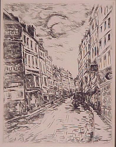 RUE DE PARIS, etching, signed in the plate (beveled), image 12 ½ x 10”, full margins, discardable frame (with glass). $200/400