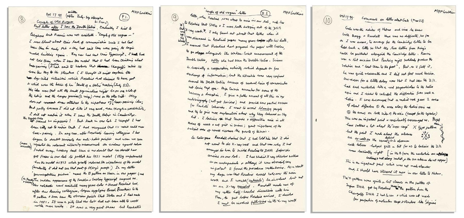 Fantastic Maurice Wilkins autograph manuscript signed, dated 17 October 1999. Highly detailed manuscript discusses a March 1953 letter Wilkins had written to Francis Crick after seeing the Watson & Crick double-helix for the very first time, including numerous references to Rosalind Franklin whom many credit with first discovering the DNA helix. Included is a photocopy of that original 3 March 1953 letter on ''Kings College'' letterhead. Manuscript, written in black ink, is on three pages with a bold ''MHF Wilkins'' signed at the upper right corner of each page. Wilkins provides extensive detail of the working relationship between the parties (including Watson, Crick, and Rosalind Franklin) and the order of events leading to their discovery. Reads in part: ''…after I saw the Double Helix…Evidently I tried to telephone but Francis was not available…I was blunt about their [Watson & Crick] lack of communication since I had last seen them in early Feb & they had said they were going to begin model building again. They now had sent their typescript. I had not told them when I saw the model that I had been thinking about base-pairing (earlier I had said to Watson that Chargaff's 1:1 ratios were the key to the structure (I thought it might explain the lop-sided intensibic [?] which Rosalind had claimed to have got & which were the basis of her 'Death of a Helix' meeting (July 52). My idea was that all the small pyrimidines might be on one side of the helix and the longer purines (2 rings) were on the other side. Olby [Crick's biographer] does not draw attention to the importance of my base-pairing idea: And partly because I did not like it very much, even though a possibility, I did not maintain it when I saw the Double Helix in Cambridge. The Double Helix seemed so impressive! But back in our lab I thought I had been silly not to maintain that I recognized that 1:1 ratios could mean base-pairing. In any case, after Rosalind's leaving colloquium I had begun to doubt seriously her anti-helix position and when we soon (more accurately) repeated the relevant intensity measurements the evidence against helices faded away. Looking back there is no doubt that we should have got Fraser in our lab to publish his 1951 model (Olby unfortunately has the model in 1952 which greatly reduced the importance of the model (evidently I did not see that part of Olby's proofs.) In my letter 'paracrystalline picture' means the B pattern as shown in our paper. The sudden appearance of the Franklin & Gosling typescript surprised me. Her [Rosalind Franklin] notebooks were available many years later & showed Rosalind had, after her leaving the colloquium, begun applying Bessel Functions to the B pattern & soon saw the obvious points that Stokes and I had made in 1951. It was a pity that our lab had not been able to work with more unity. It was a very great shame but Randall's letter, when Rosalind was about to arrive in our lab, made clear to Rosalind that Stokes & I were both dropping out of the DNA X-ray work.* That was not my intention! I only found out about that letter when it was discovered in Rosalind's papers many years after her death. I assumed that Rosalind had prepared her paper with Gosling, to go alongside the Watson-Crick announcement of the Double Helix, after she had seen the Double Helix…I give a fuller account of all this in my autobiography (not yet finished) and provide some partial excuses for Randall's behavior. I want to avoid blaming people and try to give more explanation about why they behaved as they did. I believe that tensions & difficulties arise in all areas of work & not just in science; great importance of the subject area of course increases the growth of tensions. In later years Randall claimed that I had told him that I did not want to do X-ray work and that was why I had arranged for him to switch Rosalind to DNA before she arrived in our lab. I had studied X-ray structure method as an undergraduate & although it was obviously very important I found the procedure rather boring. As a result my hope was that Rosalind would take over the main work and I would (certainly) be involved but not as an x-ray specialist. Randall made use of my rather half-hearted discussion with him. Then, just before Rosalind arrived, I decided I must be involved full-time in the x-ray work…'' The last section of the manuscript refers particularly to the famed April 1953 ''Nature'' magazine debuting DNA as a double helix structure that drove Wilkins, Watson & Crick to their fame: ''…Gale was the editor of Nature and since he knew both Bragg & Randall there was no difficulty, so far as I was aware, to arrange for the Cambridge letter to be held back a little so that the two letters from King's could be published alongside the Cambridge letter. Francis was a bit anxious that Pauling might suddenly produce the solution and 'beat them to the post'. But, as I felt it, he was quite reasonable and I did not feel much tension…'' Last page also includes two illustrations of the double helix and its structure. Manuscript measures 8.25'' x 11.5'' with staple holes at top left and very minor foxing in spots. Near fine.