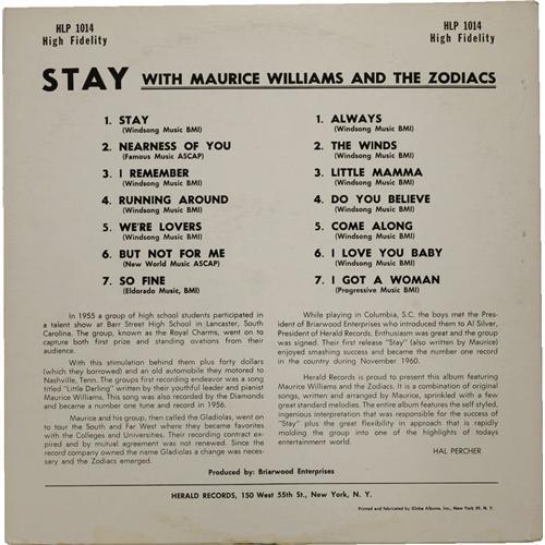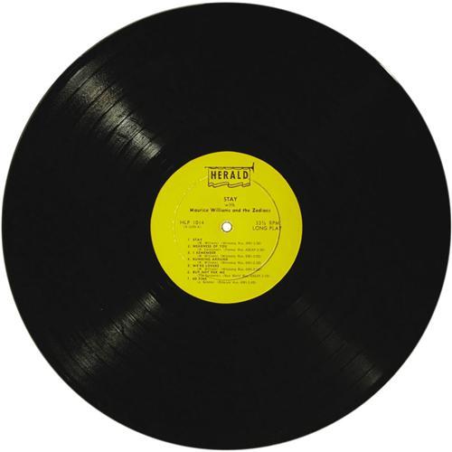 <B>Maurice Williams and the Zodiacs "Stay" LP (Herald 1014, 1961).</B></I> Is there another song from 1961 that's as recognizable from the first downbeat as the uplifting "Stay"? Williams had a #1 hit with it, and it's been successfully reprised as big hits for the Four Seasons (#16 in 1964) and Jackson Browne (#20 in 1978). For all the success of the single, the album of the same name didn't chart, and is a bit hard to find these days. Here's a nice copy! Condition: EX 7 (3" seam split at bottom center)/ EX 7.<BR><BR><b>Shipping:</b> Recordings (<a target="_blank" href="http://www.heritageauctions.com/common/shipping.php">view shipping information</a>)