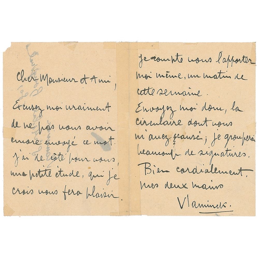 ALS in French, signed ‰ÛÏVlaminck,‰Û two pages taped together to an overall size of 8.5 x 6, no date. Letter to his friends, in full (translated): "Truly you must excuse me for not having yet sent this note. I have put aside for you a little study, which I think will please you. I expect to bring it to you myself one morning this week. So please send me the circular you mentioned; I will group together a lot of signatures. Warmest greetings and hearty handshake." In very good condition, with minor loss to the upper left corner, and old tape stains affecting appearance.