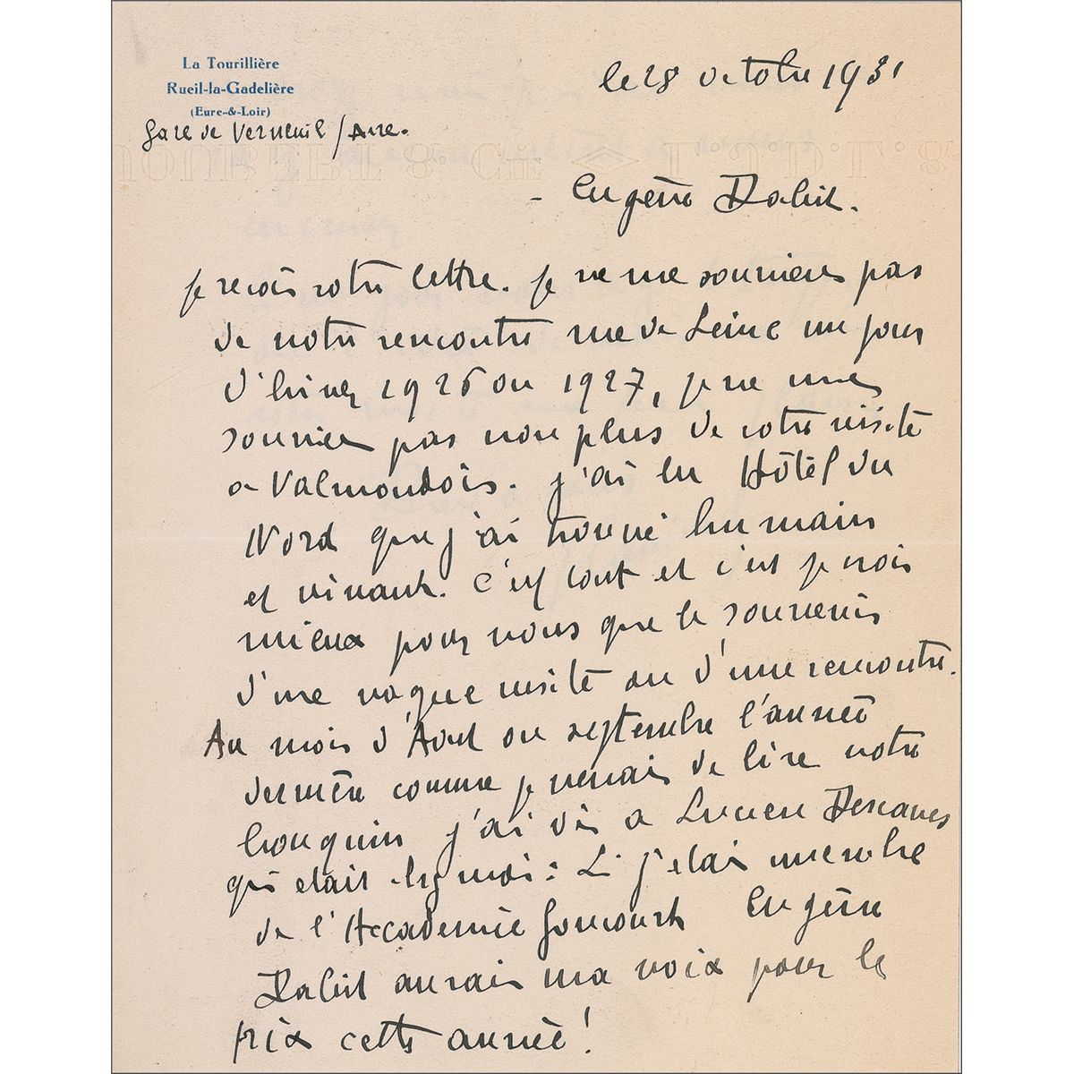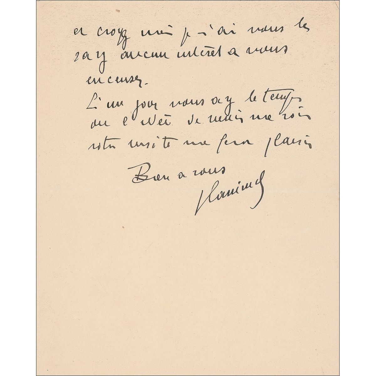 French artist (1876–1958) and a member of the Fauvists, his work is typically marked by bold colors and eccentric brushwork. ALS in French, signed “Vlaminck,” two pages on two adjoining sheets, 6 x 7.5, La Tourilliere letterhead, October 18, 1931. Letter to novelist and painter Eugene Dabit. In part (translated): “I’ve read Hotel du Nord which I found human and lively…as I said to Lucien Descaves…if I were a member of the Academie Goncourt Eugene Dabit would get my vote for the prize this year! And believe me you know I have no self-interest in singing your praises. If one day you have the time and notion to come and see me, your visit will give me pleasure.” In fine condition, with central horizontal fold through portion of signature and mild toning. Novelist Lucien Descaves was a founding member of the Academie Goncourt. Dabit’s Hotel du Nord never won the Goncourt prize but did get the Prix du Roman Populiste. The classic movie Hotel du Nord appeared in 1938.