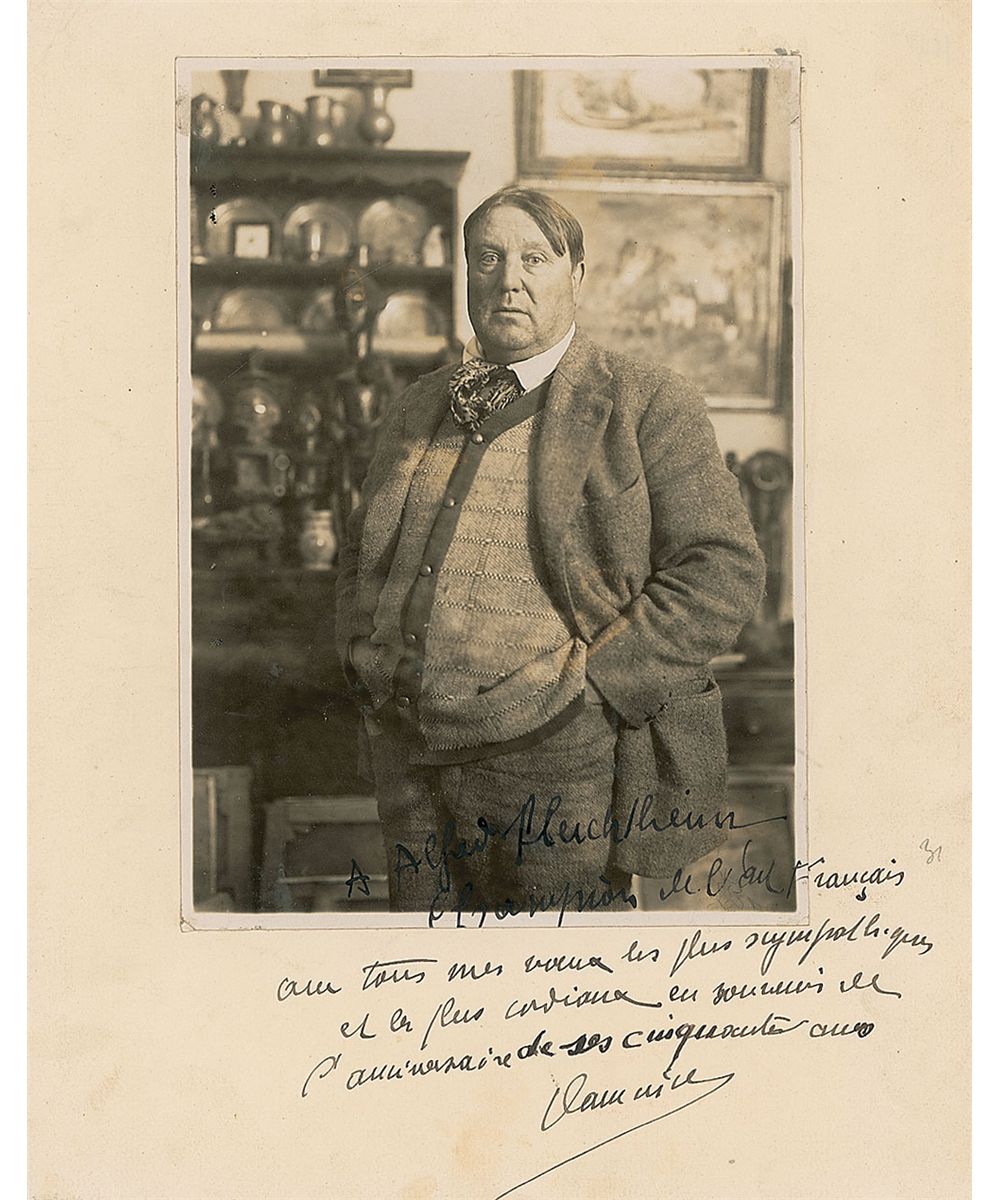 French artist (1876–1958) and a member of the Fauvists, his work is typically marked by bold colors and eccentric brushwork. Vintage glossy 6.25 x 8.75 photo, affixed to a 9.5 x 12.5 off-white sheet, inscribed in French, beginning on the photo and extending onto the sheet, to German art dealer and collector Alfred Flechtheim, and signed “Vlaminck.” In very good condition, with scattered creases, mild horizontal rippling from adhesive, and some toning and wrinkling to sheet.