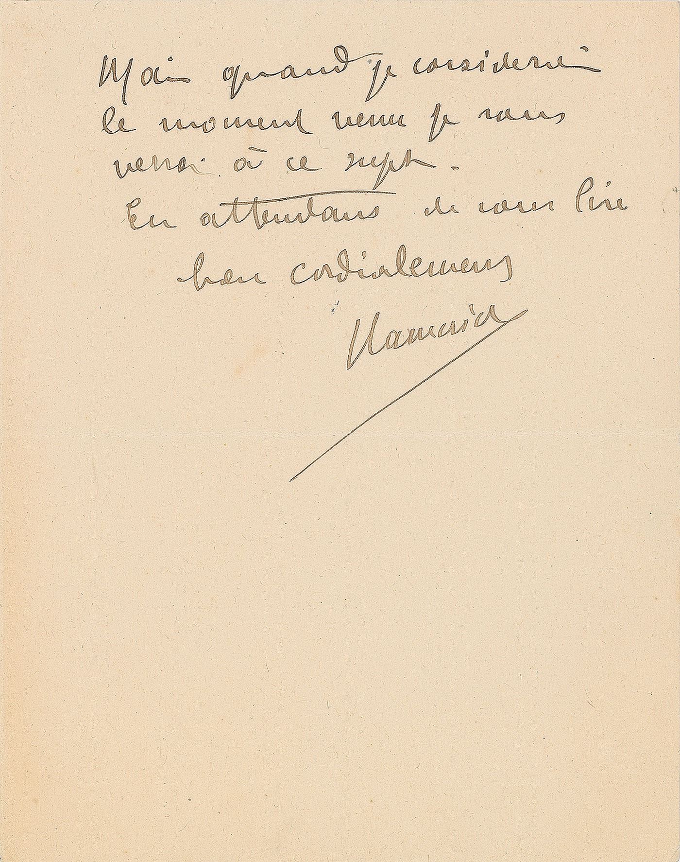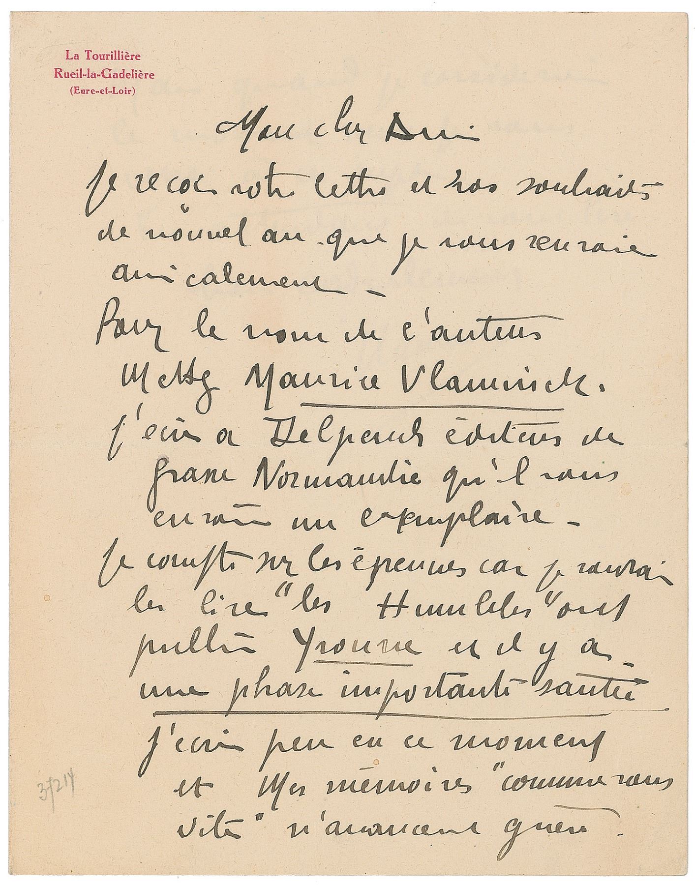 French artist (1876–1958) and a member of the Fauvists, whose work is typically marked by bold colors and eccentric brushwork. ALS in French, signed “Vlaminck,” two pages on two adjoining sheets, 6 x 7.75, La Tourilliere letterhead, no date but circa 1927. Letter to his editor, in part (translated): "I received your letter and your New Year’s wishes that I am sending back to you in a friendly way. For the name of the author put Maurice Vlaminck. I’ve written to Delpeuch, editor of Grasse Normandie, that he send you a copy…I write very little right now and my memoirs, as you say, do not move forward." In fine condition. The book Grasse Normandie by Gabriel Reuillard, illustrated by Vlaminck, was published by Andre Delpeuch in 1926.