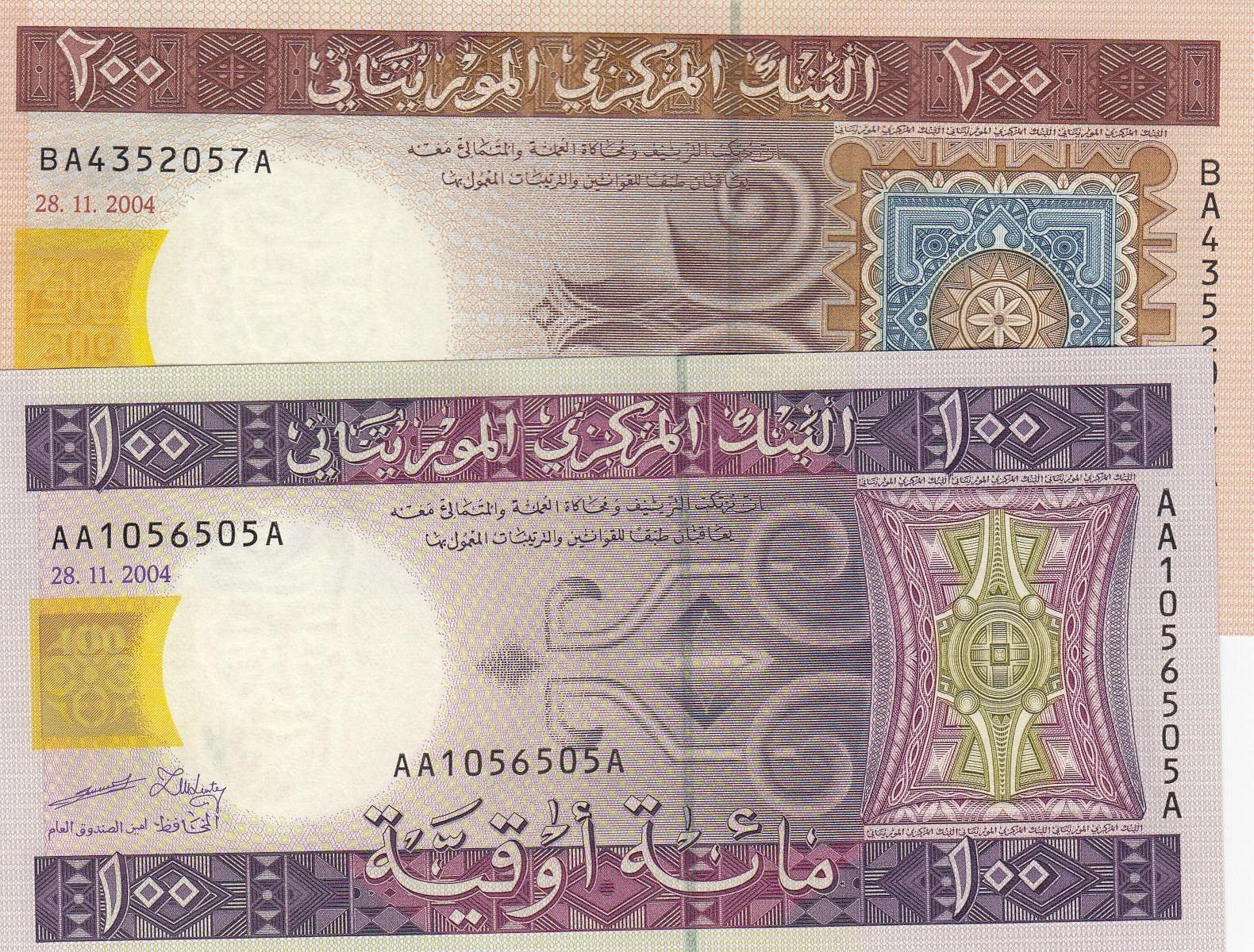Mauritania, 100 Ouguiya and 200 Ouguiya, 2004, UNC, p10, p11, (Total 2 banknotes)br/serial numbers: AA1056505A and BA4352057A