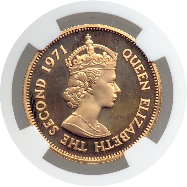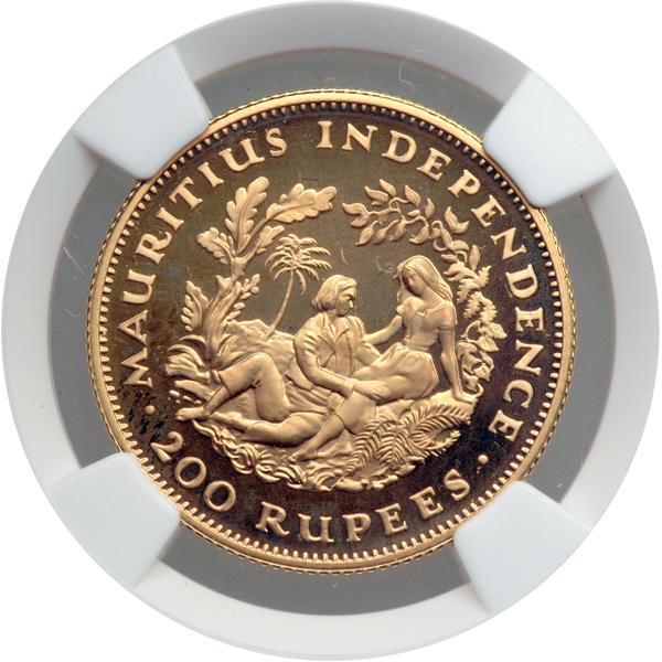 Mauritius. 200 Rupees, 1971. Fr-1; KM-39. Weight 0.4587 ounce. Elizabeth II. Reverse: Native scene. Mintage 2.500 struck. NGC graded Proof 68 Ultra Cameo.