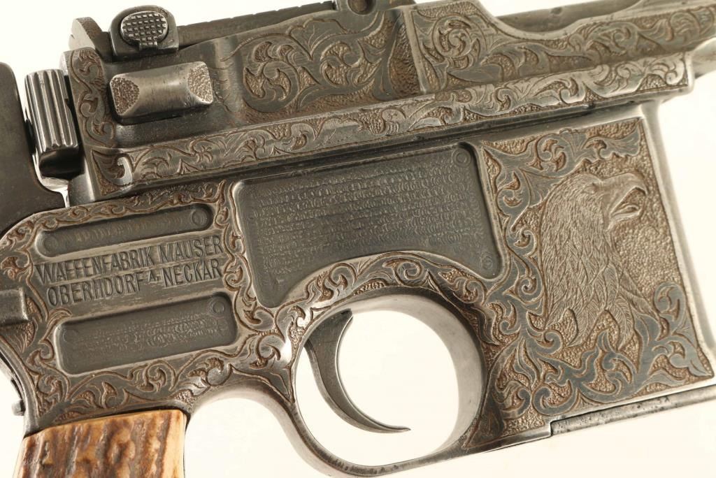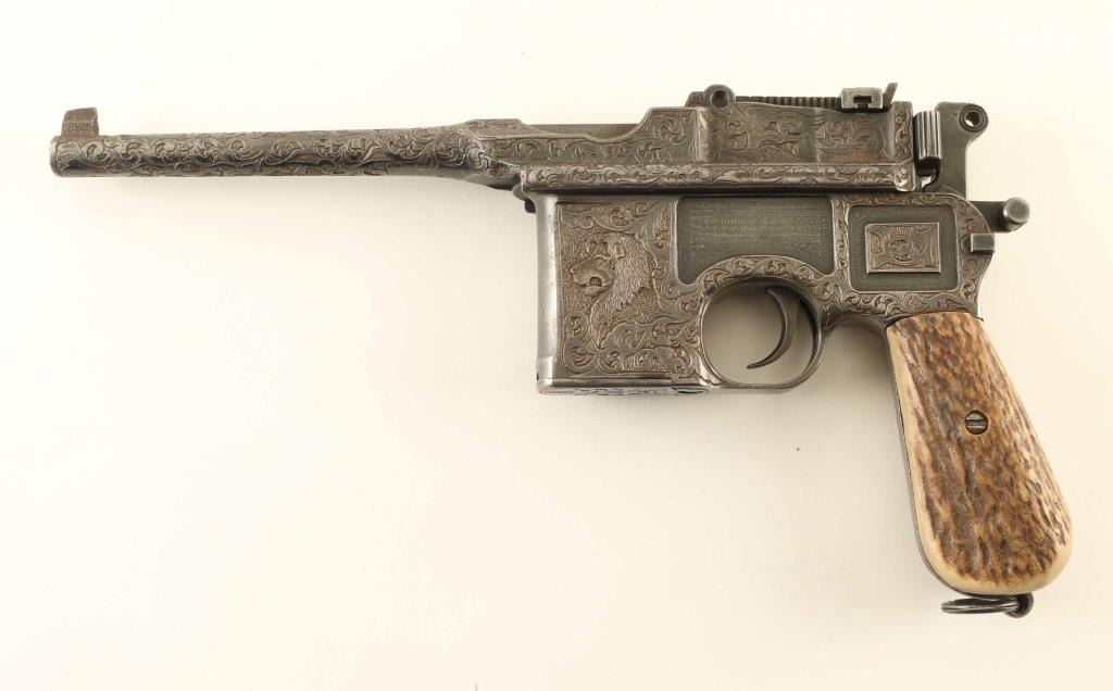 'Engraved ' German semiautomatic pistol features blued finish, stag or antler grips, 5.5" barrel, blade front & tangent rear sights, fixed 10 round magazine, manual safety, lanyard ring at butt. Bore is good condition, dark and lightly pitted, strong rifling. Pistol is engraved over approx 80% of its surface with floral scrolls, Lion's head on left side of magazine, Eagle's head on right side. Metal finish is a gray color, darker in recesses and ligter on high spots, giving a good contrast for observing the details of the engraving. Mauser two line address marking on right side of frame is deep & even, a bit dished looking. Grips are very good condition. Condition is NRA Very Good (engraved / refinished) *** C&R Firearm ***