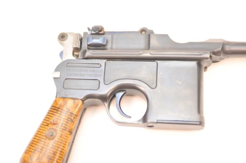 Mauser 1896 semi-automatic pistol, .30 Mauser caliber, Serial #519525. The pistol is in nearly excellent overall condition as professionally re-finished. The pistol retains nearly all of a quality re-blue withall matching serial numbers and bright niter blue on the small parts. The grips have been redone with an extra coat of lacquer added. The bore is good, the action it functions well and the markings are crisp on thisdesirable Bolo Mauser. Est.: $750-$1,500. (C+R/PPT).