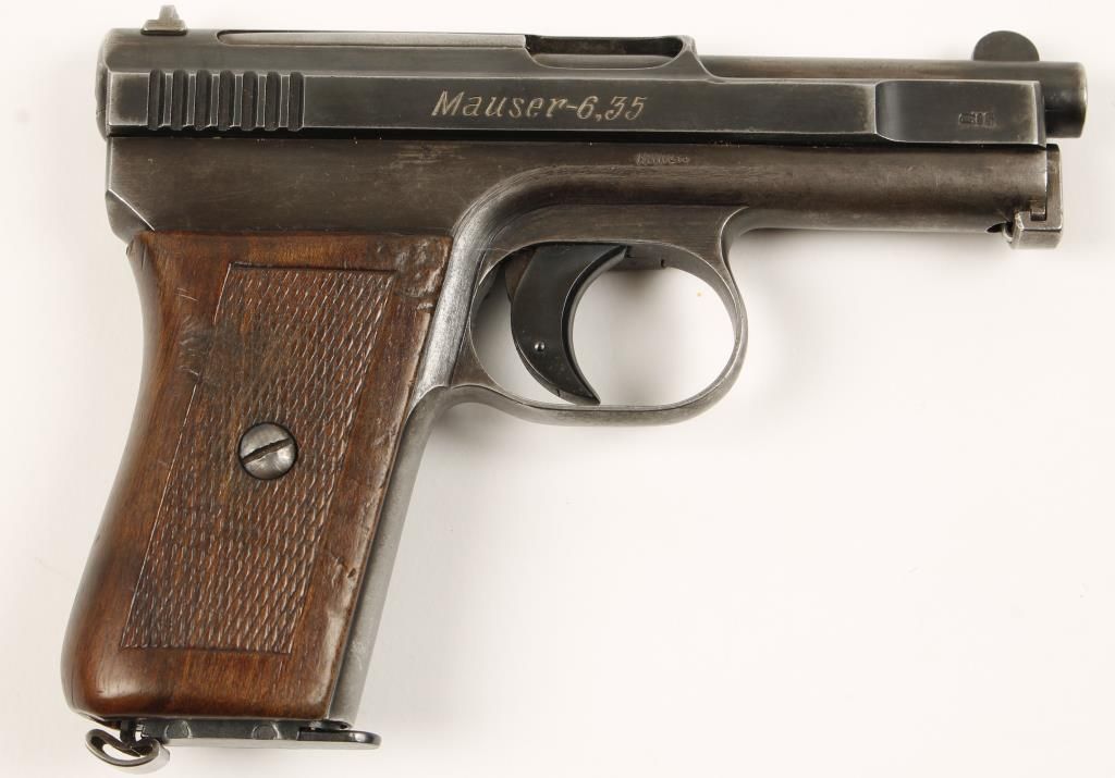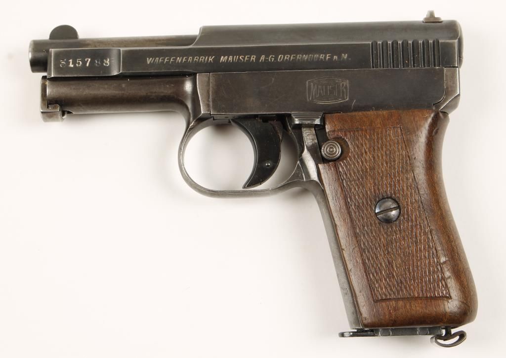 Single action semi-automatic pistol. Blued steel with walnut grip. Bluing has faded and has edge wear. The barrel is 3" long and has strong rifling but there is a ring in the bore. Grip has a crack running up the back, the checkering is worn and there are many dings and rubs. Chips are missing from the top of the grip. It comes with one magazine. Condition is good. *Curio & Relic*