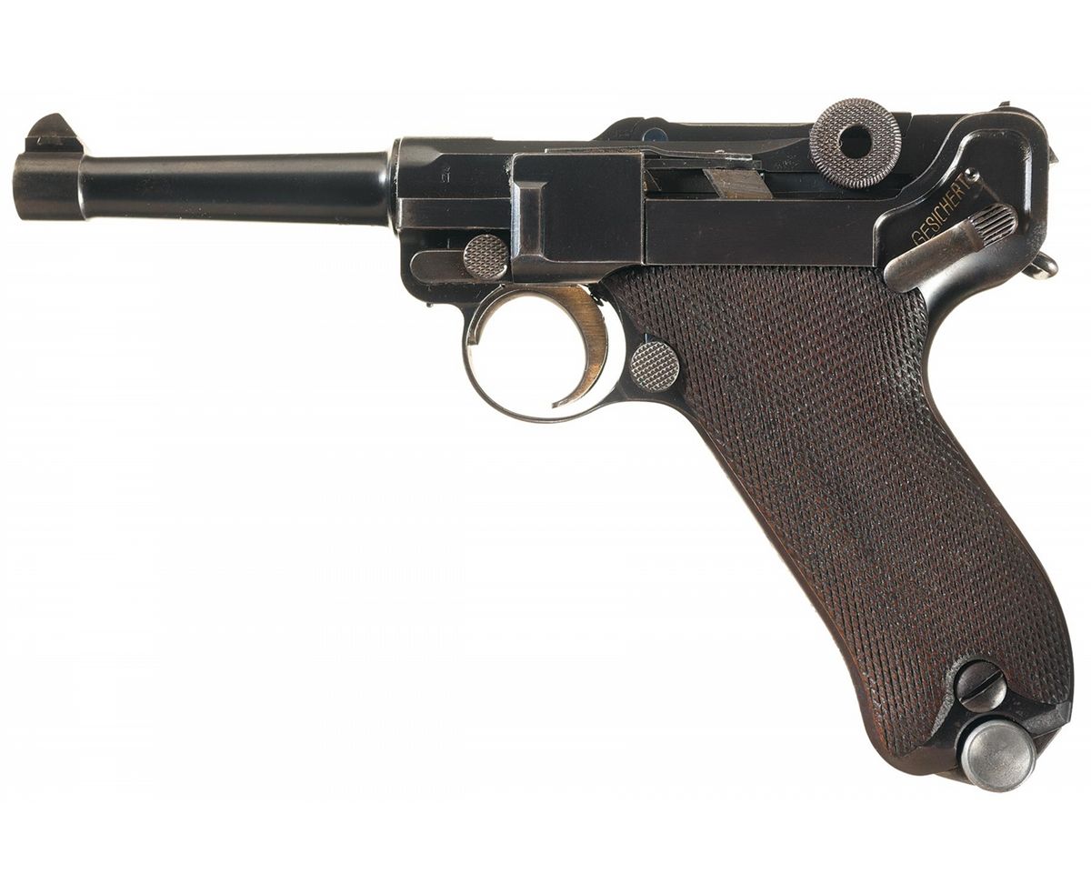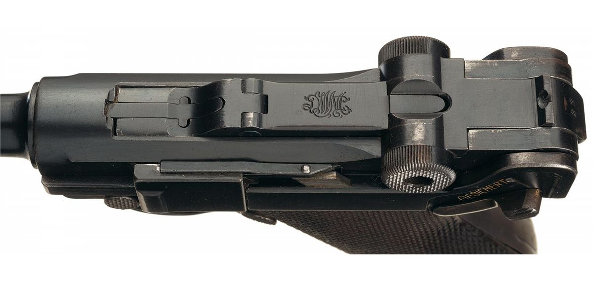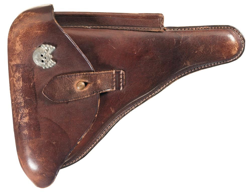 The chamber is blank and the right side of the barrel extension and front strap are stamped with a Weimar property mark "H.P.428." DWM markings and the standard "Crown/N" commercial proofs on the left side of the barrel extension, breech block and underside of the barrel. It still retains the spring sear bar over the side plate and is fitted with checkered walnut grips and has two Police marked matching depot supplied magazines with aluminum bases. The magazines have the aluminum bases made during the early Nazi era and have been stamped "s/42/7623/Eagle 154" and "s/42/7623/Eagle 154". Interestingly the back side of each magazine has also been stamped "H.P.428". Complete with an unmarked brown leather holster hat with a Nazi Death Head Visor Cap badge attached to flap and unmarked take down tool inside.