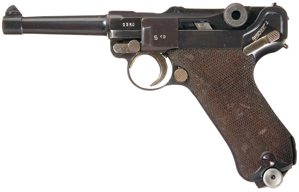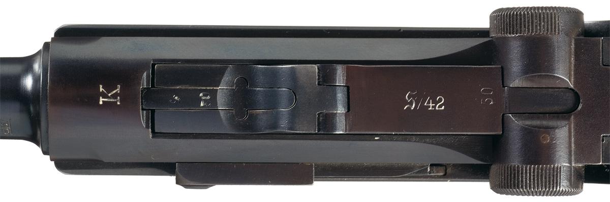 This is a nice representative example of a scarce Mauser S/42 "K" Luger pistol, first sub variation. There were the first actual new production Lugers that were produced after Hitler came to power in 1933 and they used letter codes during 1934 and 1935 to hide initial rearmament of the German military. There were four distinct sub-variations of "K" lugers with approximately only 1700 produced in this first block and they are distinguished by having the early script "S" markings on all the parts. The top of the chamber has the distinctive "K" markings indicating that it was produced in 1934 with the top of the toggle has the script "S/42" proofs indicating manufacture at the Mauser factory. The right side of the barrel extension has the double "O/37" proofs next to the early drooped wing Mauser Eagle proof, with the same markings on the left side and underneath of the barrel. The majority of the small part such as the side plate, extractor, safety ejector, magazine release button and front of the trigger guard also has the correct small script "S" markings. It has walnut checkered grips and is complete with a late style all magazine that is marked on the side "fxo/37/PO8" with the aluminum base that is marked "2/8499".