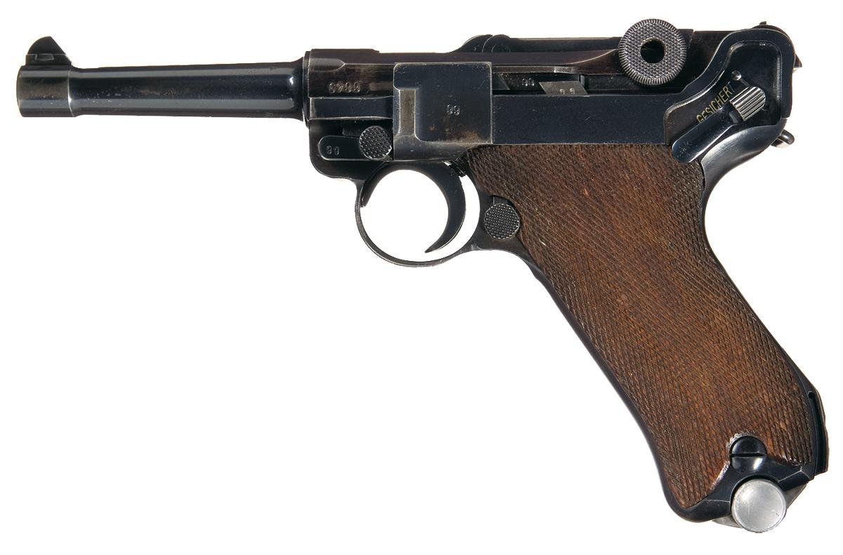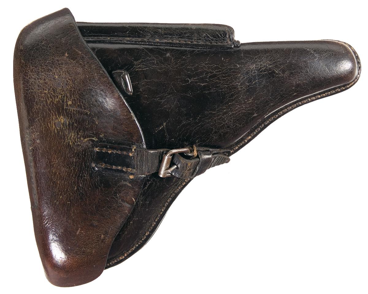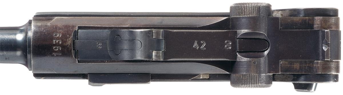 Dated 1939 over the chamber and marked "42" on the top of the toggle. Two "eagle/63" proofs and the spread winged eagle firing proof appear on the right side of the chamber, with the latter also appearing on the right side of the barrel and the left side of the breechblock. A smaller "eagle/63" is on the upper left rear of the barrel. The upper safety area and extractor are marked "GESICHERT" and "GELADEN" respectively. The magazine is blue finished with an aluminum base. Matching partial numbers on the latch, side plate, sear, safety components, toggle links, extractor, trigger, breechblock and firing pin. Toggle pin marked "CC". Checkered walnut grips. With a black leather Genschow & Co (Berlin) flap holster dated 1939.