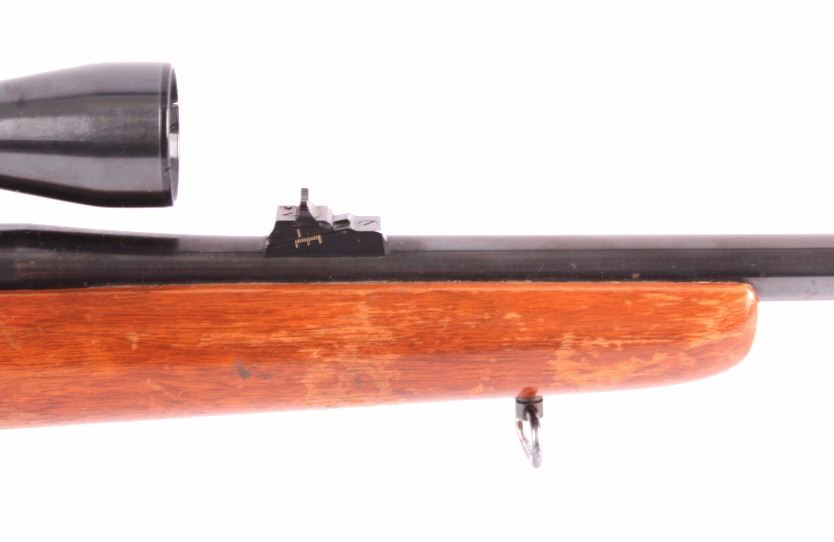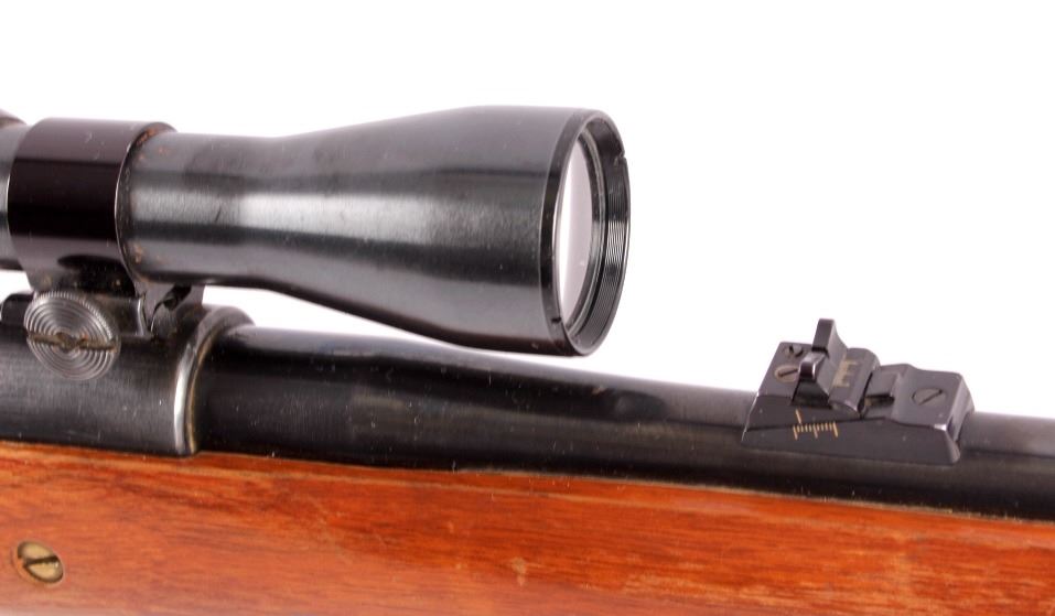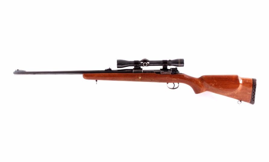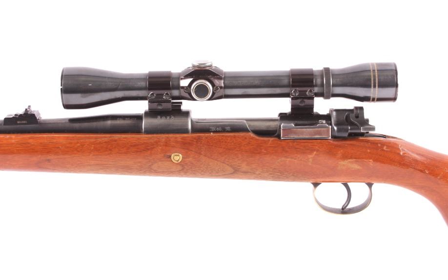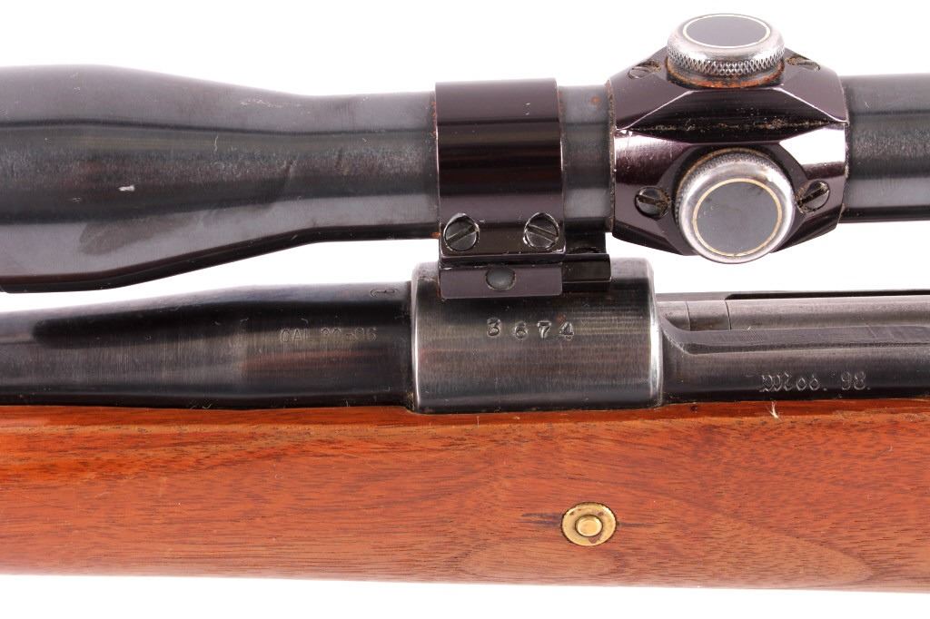 This is a Mauser 98 bolt action rifle chambered in the .30-06 caliber. The rifle features a blued steel barrel and receiver with a solid walnut hardwood stock. Also, the rifle has been fitted with a vintage scope. The receiver is marked "Mod. 98" and the barrel is marked "Cal. 30-06". The Mauser rifle is in good condition. It measures 43.25" long with a 22" barrel. Serial number is 3674. The rifle requires a Curio & Relic FFL, a NICS Background Check or FFL Transfer.