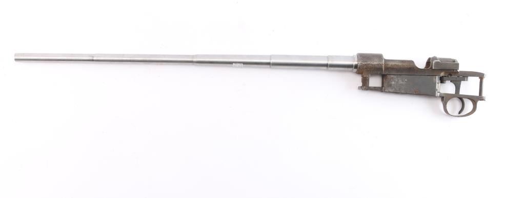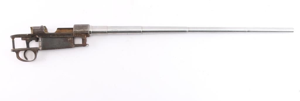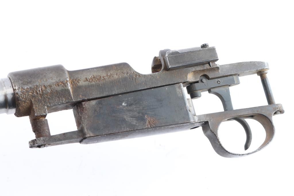 For parts or repair. Early Mauser 98 receiver with an un-populated in-the-white barrel, and the Mauser banner on the receiver ring. The receiver has a smooth curved trigger, a complete magazine with a floorplate, stripper clip guides cut into the receiver, and a functioning bolt release. Receiver displays rust and pitting. The barrel appears to be unfired with a bright bore and strong rifling.