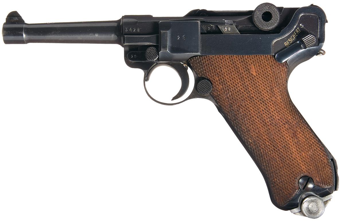 Fixed sights, with "1942" over the chamber and the Mauser banner on the toggle link. All numbers matching, with an "eagle/swastika L" proof on the right side of the extension, with "eagle/ N" on the left side of the extension and breechblock. Barrel us unnumbered, other parts match. Full blue finish, with a sear safety, backstrap lug, checkered hardwood grips and alloy Haenel magazine with police "L" proof and alloy base.