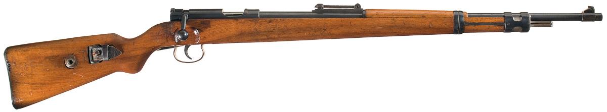 This Mauser training rifle is equipped with a blade front sight and adjustable rear sight graduated from 25 to 200 meters. The left rear of the barrel is marked "KAL 22 LANG FUR BUCHSEN", the top of the receiver ring is marked with the Mauser banner and rear is marked "KK- WEHRSPORTGEWEHR / MAUSER - WERKE A.-G. OBERNDORF a./N.". The matching serial number appears on the left rear of the barrel and the receiver at the breech, and on the bolt handle. A "crown / B" and "crown / U" proofmarks are marked on the breech end of the barrel and receiver. Mounted with a one piece round knob pistol grip stock and matching handguard. The cleaning rod is absent and the rifle is complete with an original brown leather sling with diamond pattern.