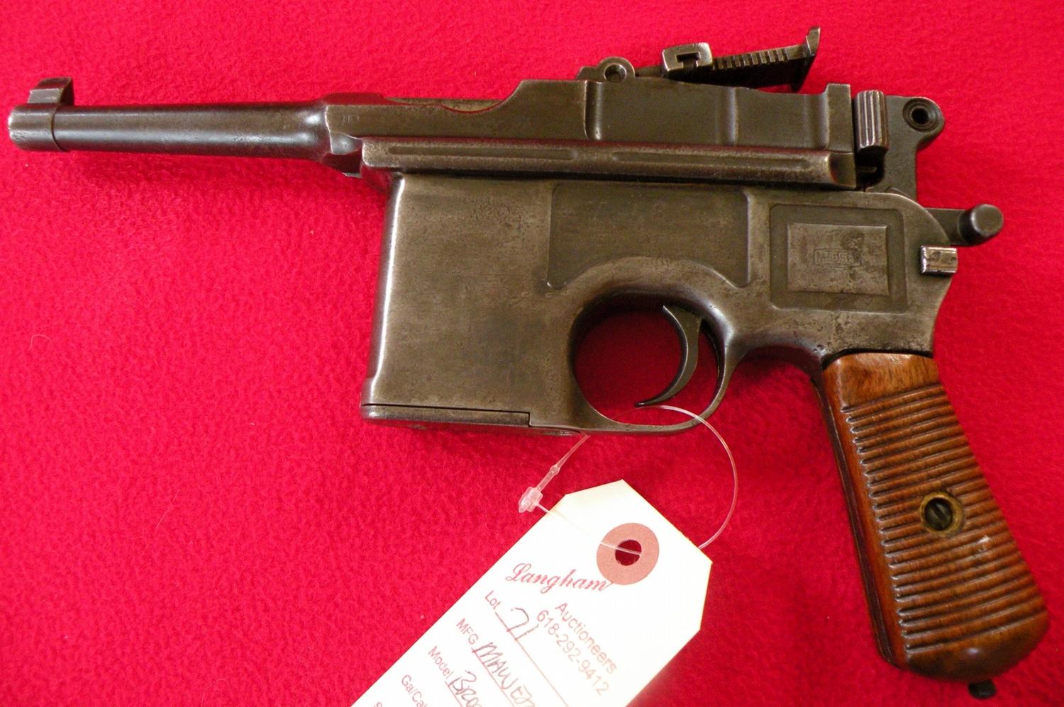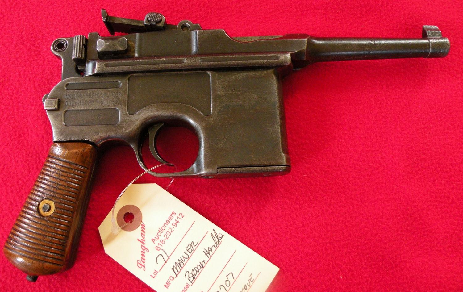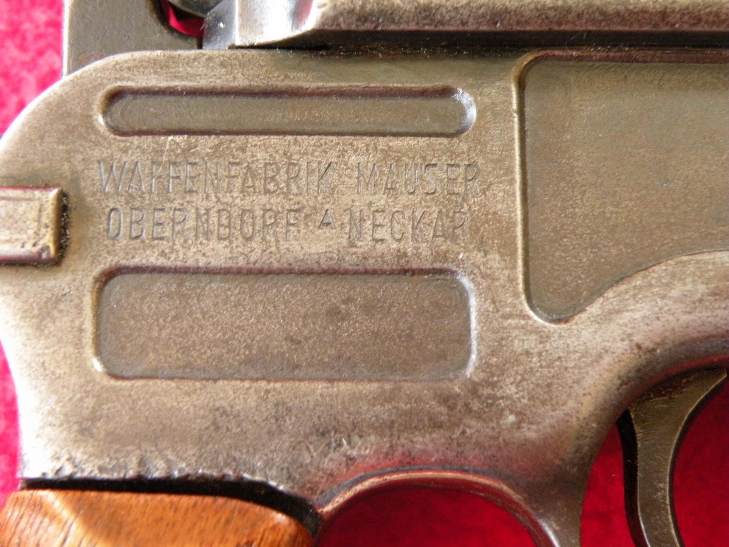 4" barrel, Waffenfabnik Mauser, Oberndorf A/N over chamber, 10 shot, 22 grooved wooden handles, tangent sight, numbers non matching, SN 77707