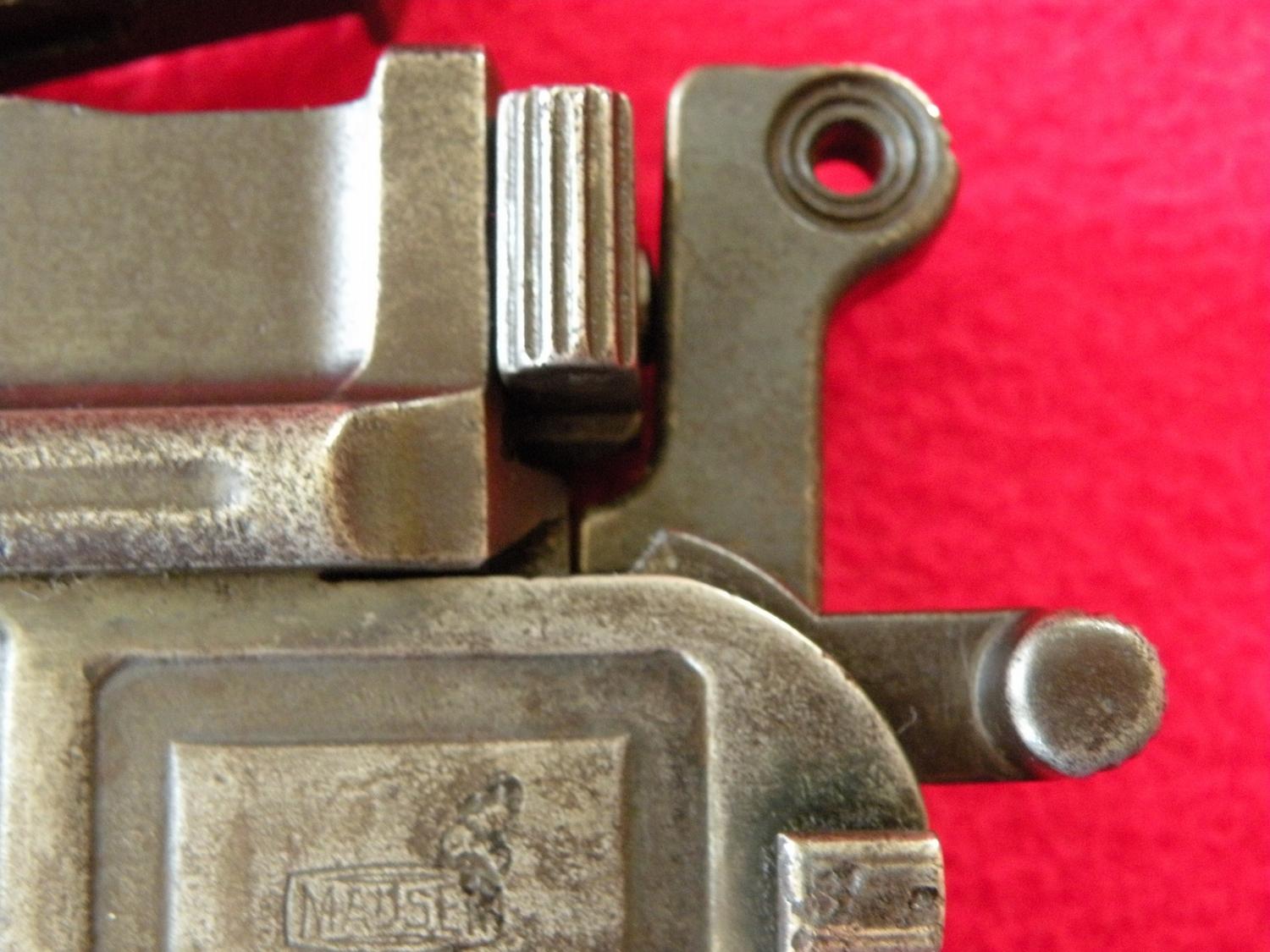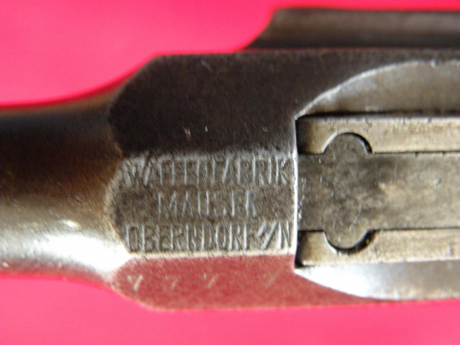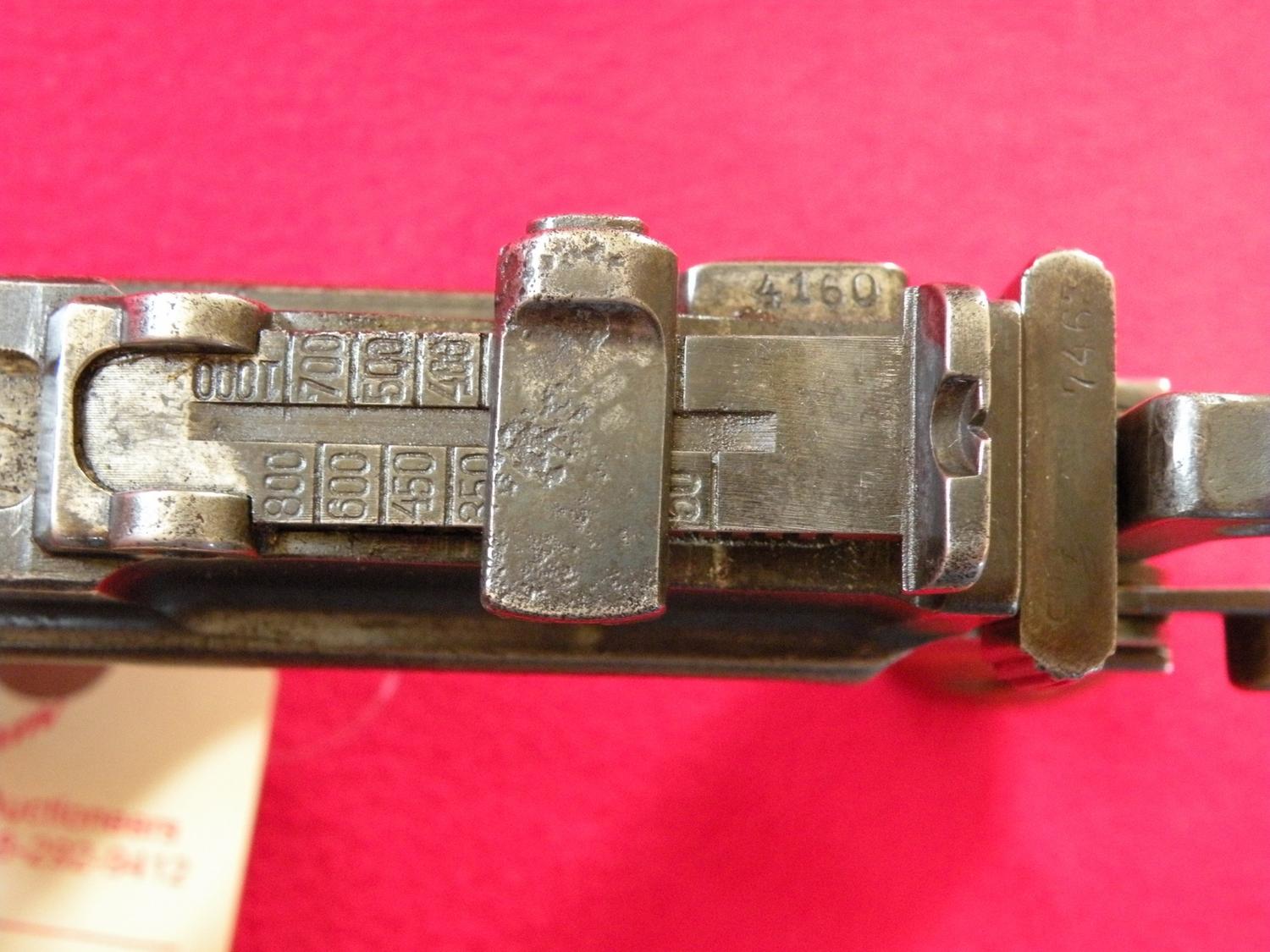 4" barrel, Waffenfabnik Mauser, Oberndorf A/N over chamber, 10 shot, 22 grooved wooden handles, tangent sight, numbers non matching, SN 77707