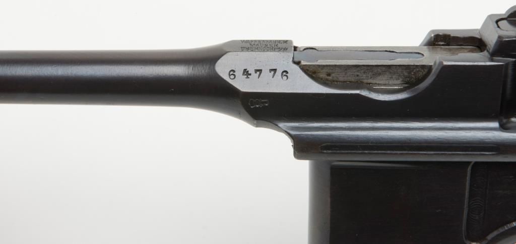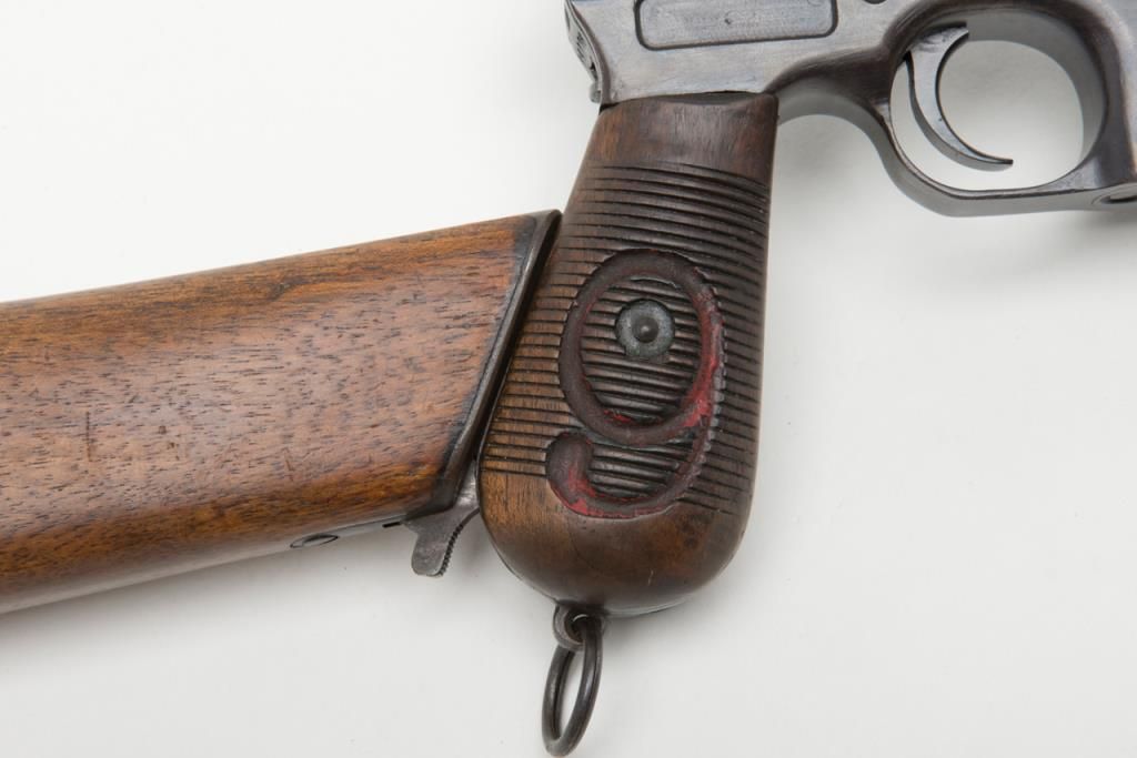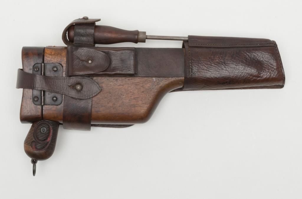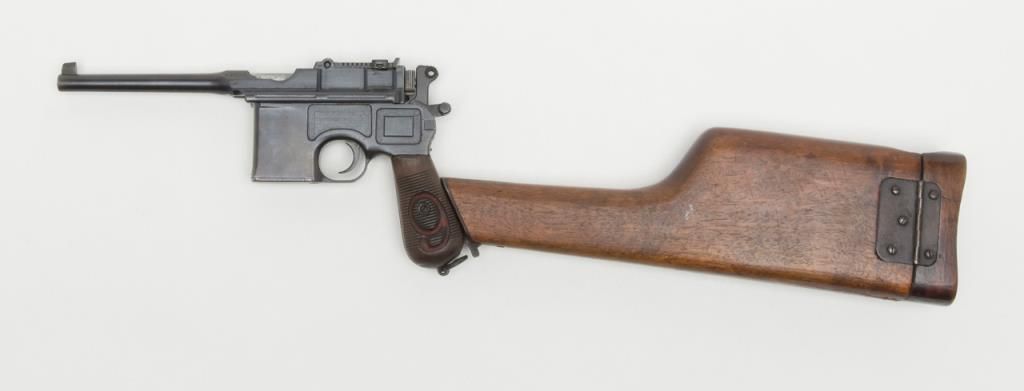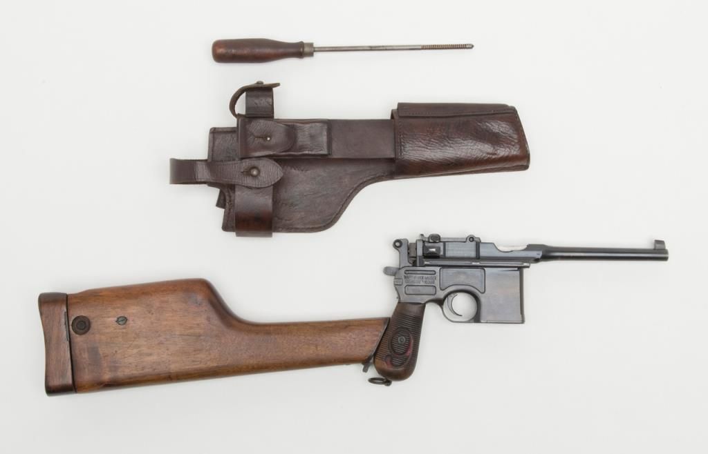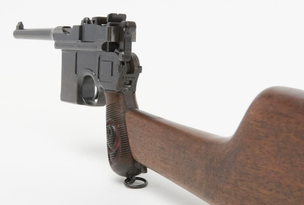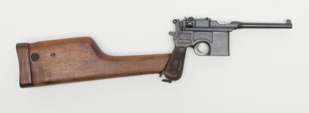 Mauser Broomhandle “Big Red 9” semi-auto pistol with wood combination shoulder stock/holster and leather carrier w/cleaning tool, 9mm cal., 5-1/2” barrel, wood grips, #64776 in overall good condition as re-built and re-finished showing themajority of its re-blue, good bore, markings, crisp action and good grips; lanyard ring present; good reproduction stock; reproduction leather carrier is marked “A.P.H. HOFFMANN BERLIN 1916” on the back between belt loops. (C&R/PPT).Est.: $750-$1,500.