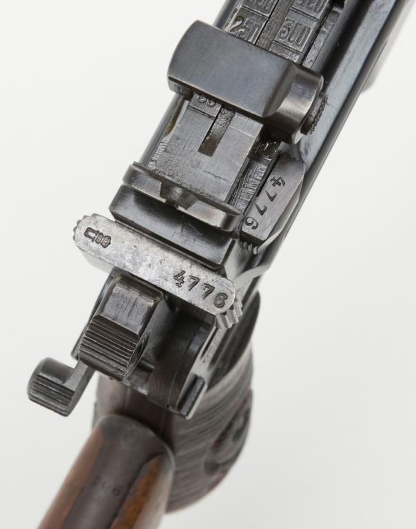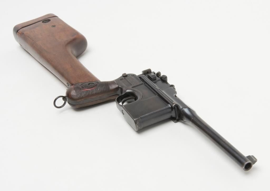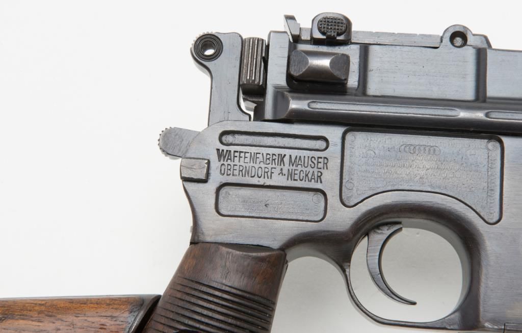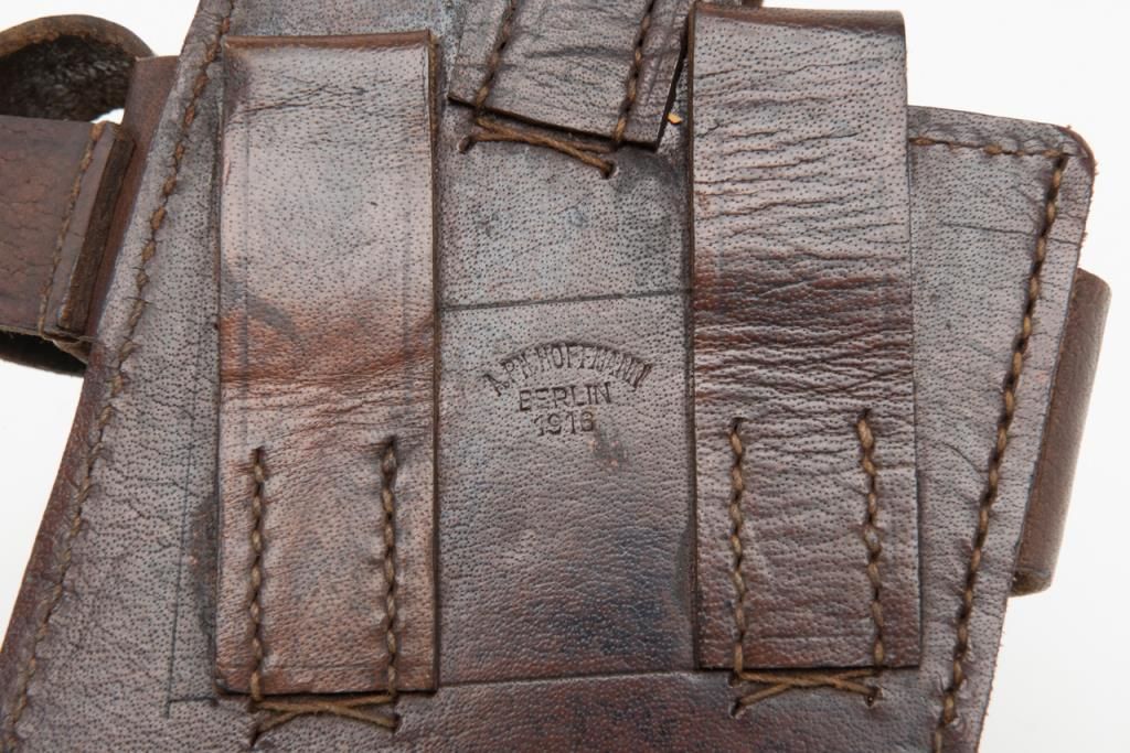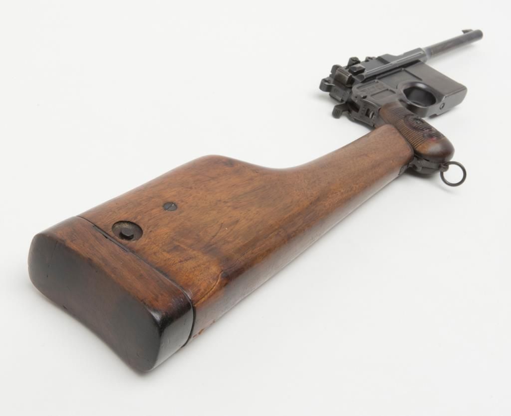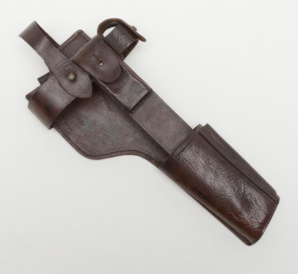 Mauser Broomhandle “Big Red 9” semi-auto pistol with wood combination shoulder stock/holster and leather carrier w/cleaning tool, 9mm cal., 5-1/2” barrel, wood grips, #64776 in overall good condition as re-built and re-finished showing themajority of its re-blue, good bore, markings, crisp action and good grips; lanyard ring present; good reproduction stock; reproduction leather carrier is marked “A.P.H. HOFFMANN BERLIN 1916” on the back between belt loops. (C&R/PPT).Est.: $750-$1,500.