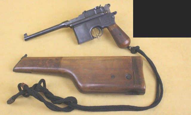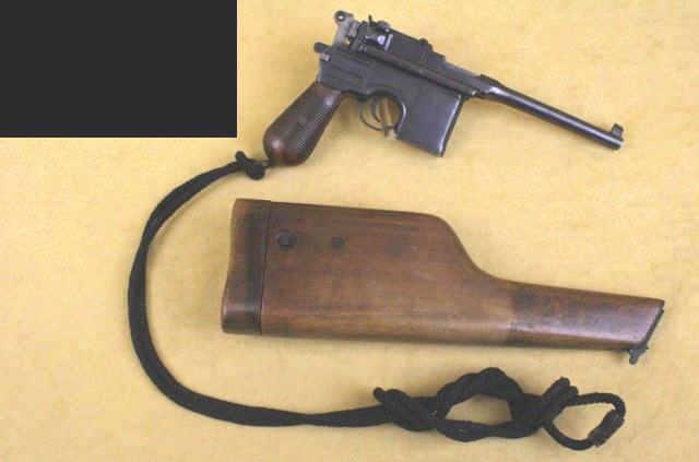Mauser Broomhandle Cal .30 SN:118763 Semi-auto pistol, 7 1/2" barrel, matte blue finish, grooved wood grips. This gun is in overall good condition showing the majority of its matte blue finish with some spots of erosion, overall good bore, markings and aSemi-auto pistol, 7 1/2" barrel, matte blue finish, grooved wood grips. This gun is in overall good condition showing the majority of its matte blue finish with some spots of erosion, overall good bore, markings and action; the grips areoverall very good; all matching visible numbers, accompanied by an un-numbered wood shoulder stock holster and leather stock holster in fair condition missing two of the three rear belt loops; also included is a long woven lanyard ropeand leather carry strap.