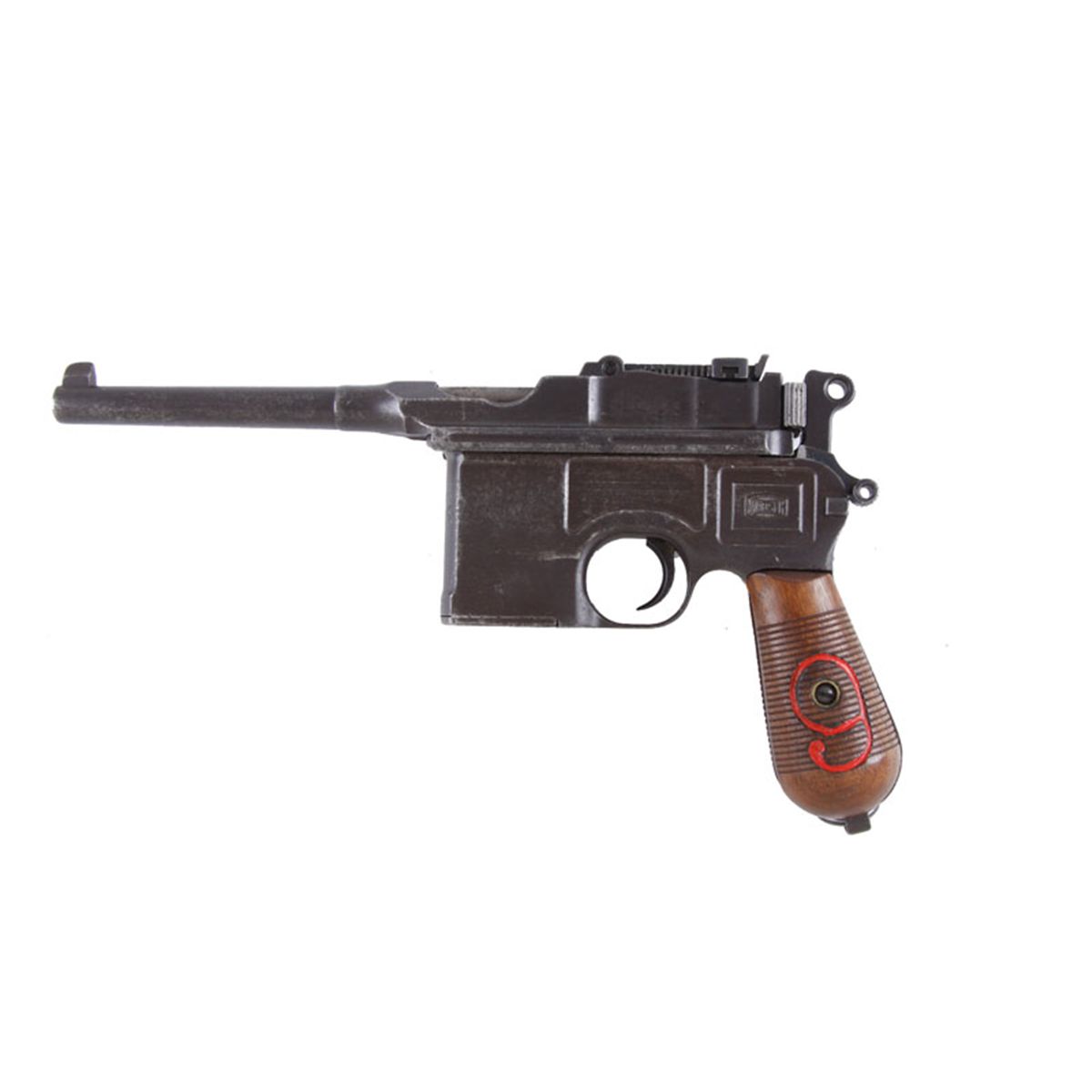 German military "Red 9" Mauser pistol with rig. Standard military configuration pistol made at the Oberndorf factory and is so marked, 5 1/4" barrel with adjustable tangent rear sight calibrated to 1000 meters, standard 24 groove handle with large "9" filled with red paint and sling swivel with cut out on the back strap for the wood holster/stock, left side of frame marked "Mauser", and top of chamber marked "Waffenfabrik Mauser Oberndorf a/N."Mauser is Chinese marked stock is a repro. Includes wood handled cleaning rod.