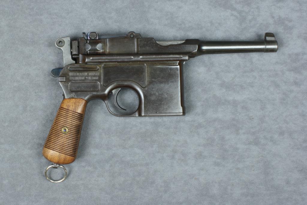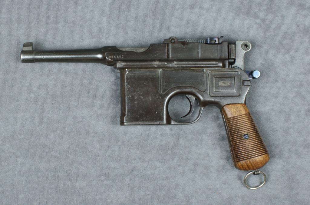 Mauser “Broomhandle” semi-auto pistol, import marked with modern leather holster and cardboard shipping box, 7.65mm cal., 4” barrel, black finish, grooved wood grips, lanyard ring, #719587. This gun is in overall good condition showing the majority of an older re-finish, good bore, action, markings and grips; holster is like new, with leather strap and cleaning rod. Est.: $400-$800.