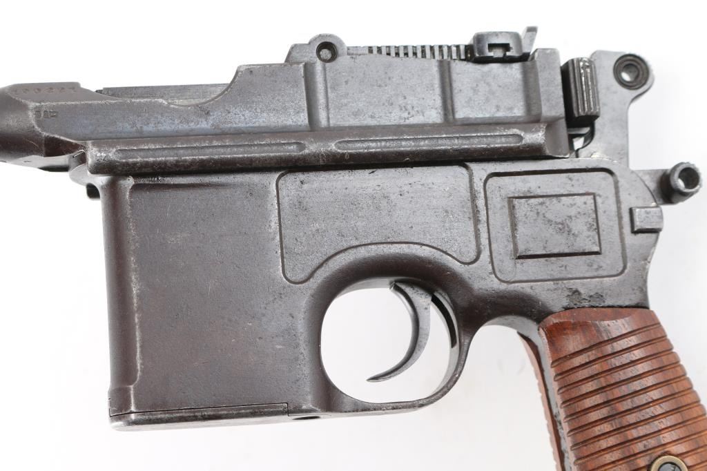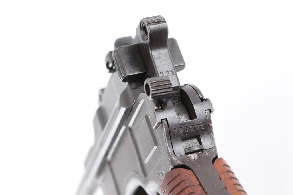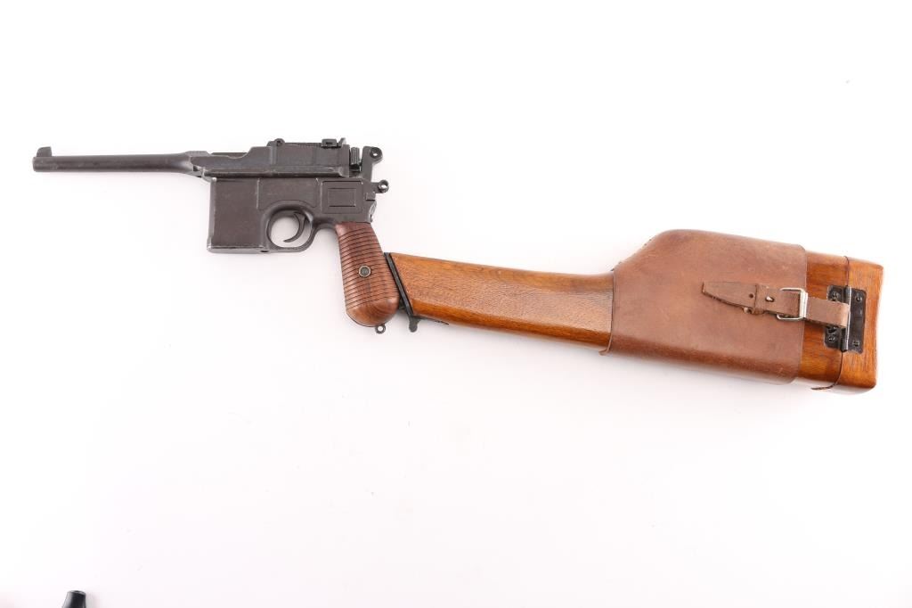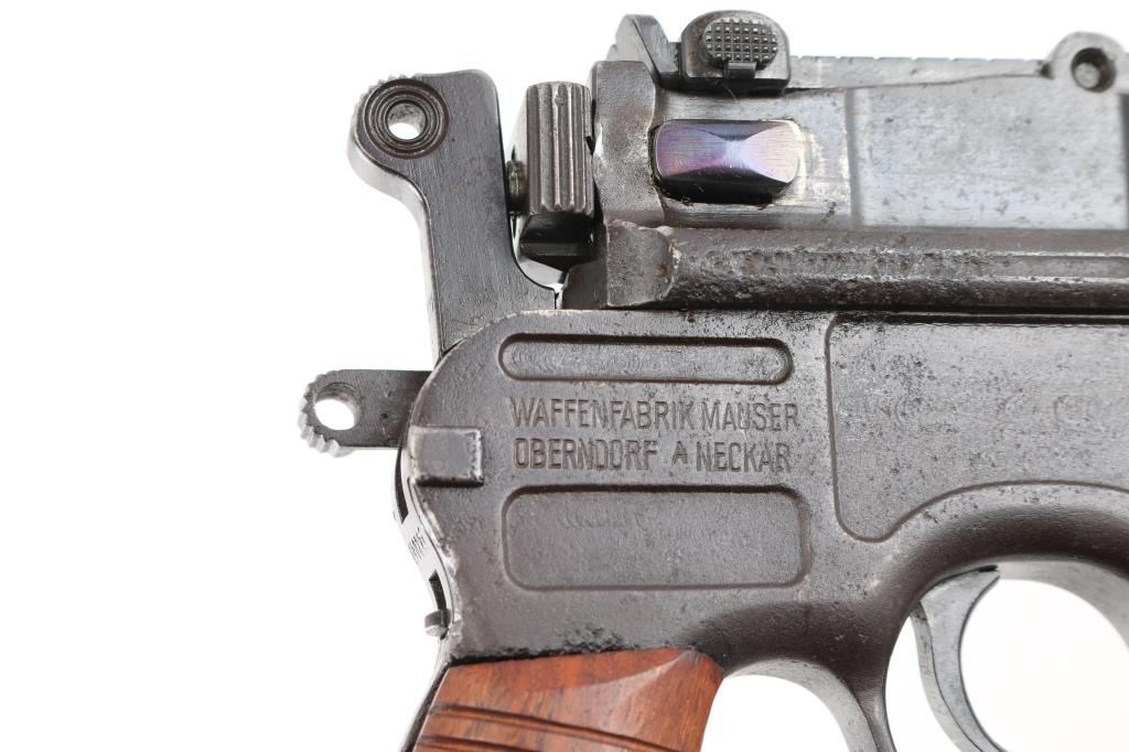 'Broomhandle' German semiautomatic pistol. Features blued finish, grooved wood grips, 5.5" barrel, blade front & tangent rear sights, fixed 10 round magazine, manual safety, lanyard stud (missing the ring) at butt. Bore is fair to good condition, strong rifling, lightly frosted. Reblued finish over 90% of the pistol shows many small pits across all surfaces, with bare metal on high spots. Locking bolt shows peacock blue heat treat color. Grips are very good condition replacements. Markings are readable, partially obscured by old pitting, including "Waffenfabrik Mauser Oberndorf a Neckar" on right side of frame, and similar address on top of chamber area. Mauser banner not present. Numbers match where observed. Includes wooden shoulder stock type holster with partial leather harness (no carry strap). Condition is NRA Good+ (reblued) *** C&R Firearm ***