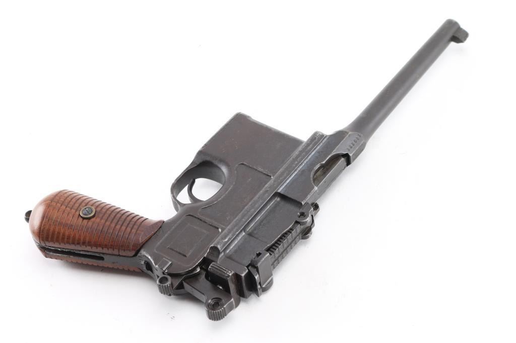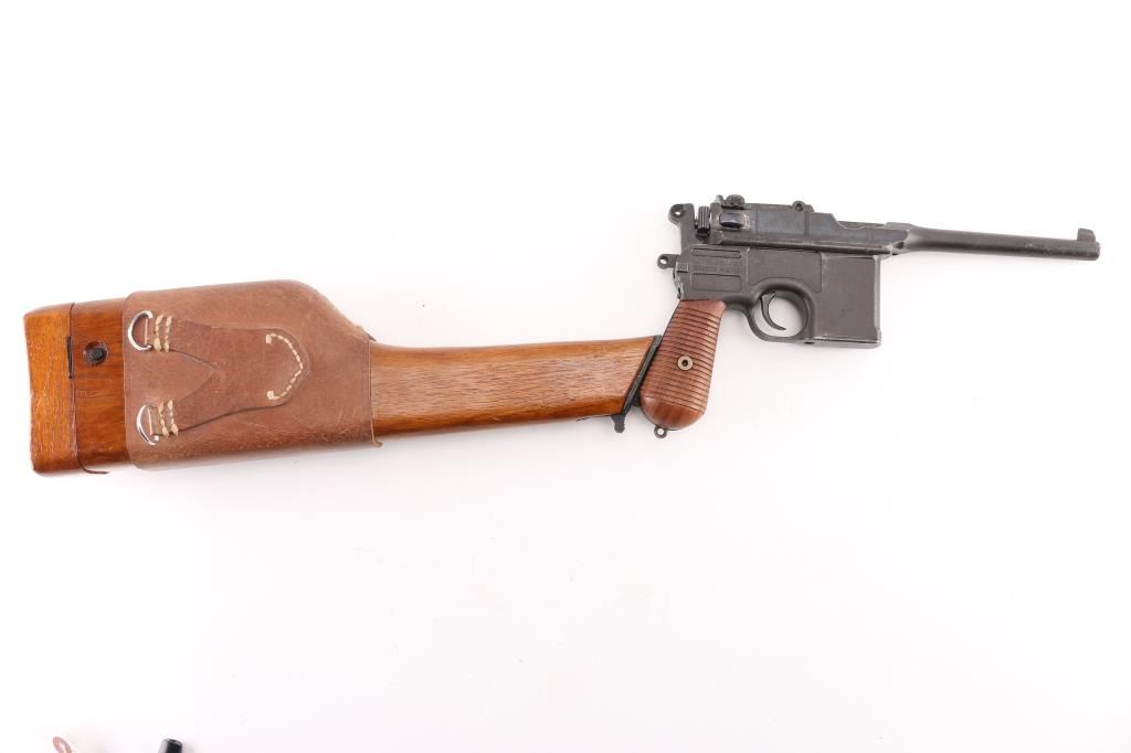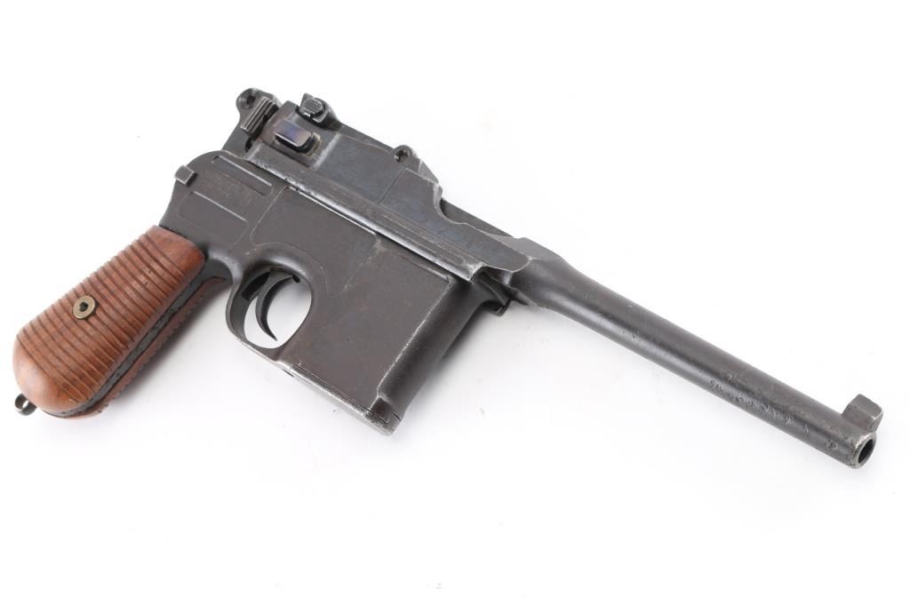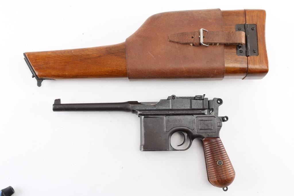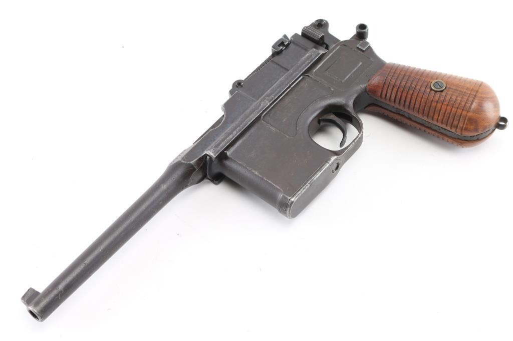 'Broomhandle' German semiautomatic pistol. Features blued finish, grooved wood grips, 5.5" barrel, blade front & tangent rear sights, fixed 10 round magazine, manual safety, lanyard stud (missing the ring) at butt. Bore is fair to good condition, strong rifling, lightly frosted. Reblued finish over 90% of the pistol shows many small pits across all surfaces, with bare metal on high spots. Locking bolt shows peacock blue heat treat color. Grips are very good condition replacements. Markings are readable, partially obscured by old pitting, including "Waffenfabrik Mauser Oberndorf a Neckar" on right side of frame, and similar address on top of chamber area. Mauser banner not present. Numbers match where observed. Includes wooden shoulder stock type holster with partial leather harness (no carry strap). Condition is NRA Good+ (reblued) *** C&R Firearm ***