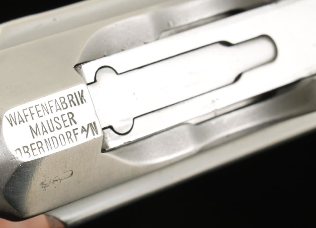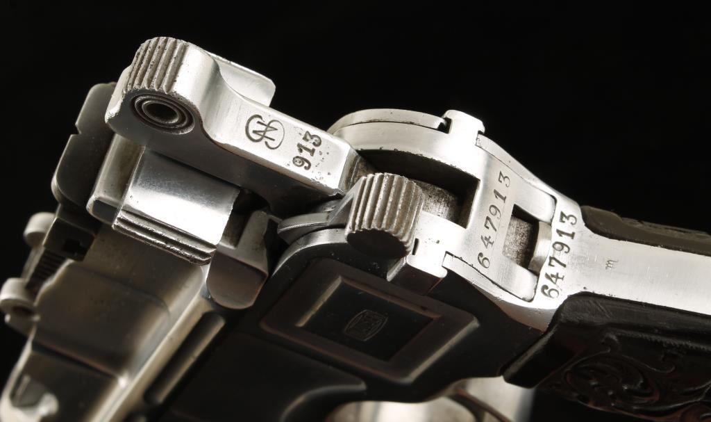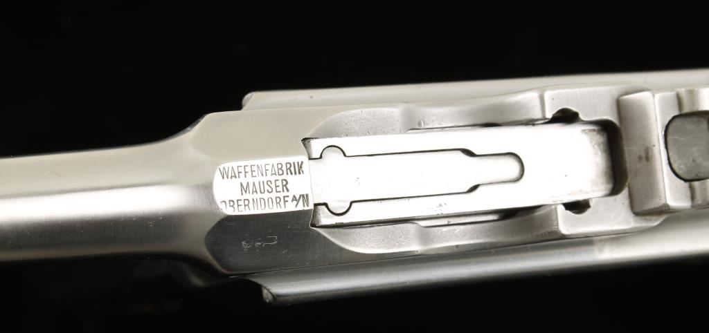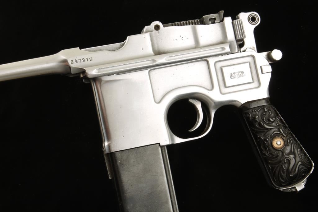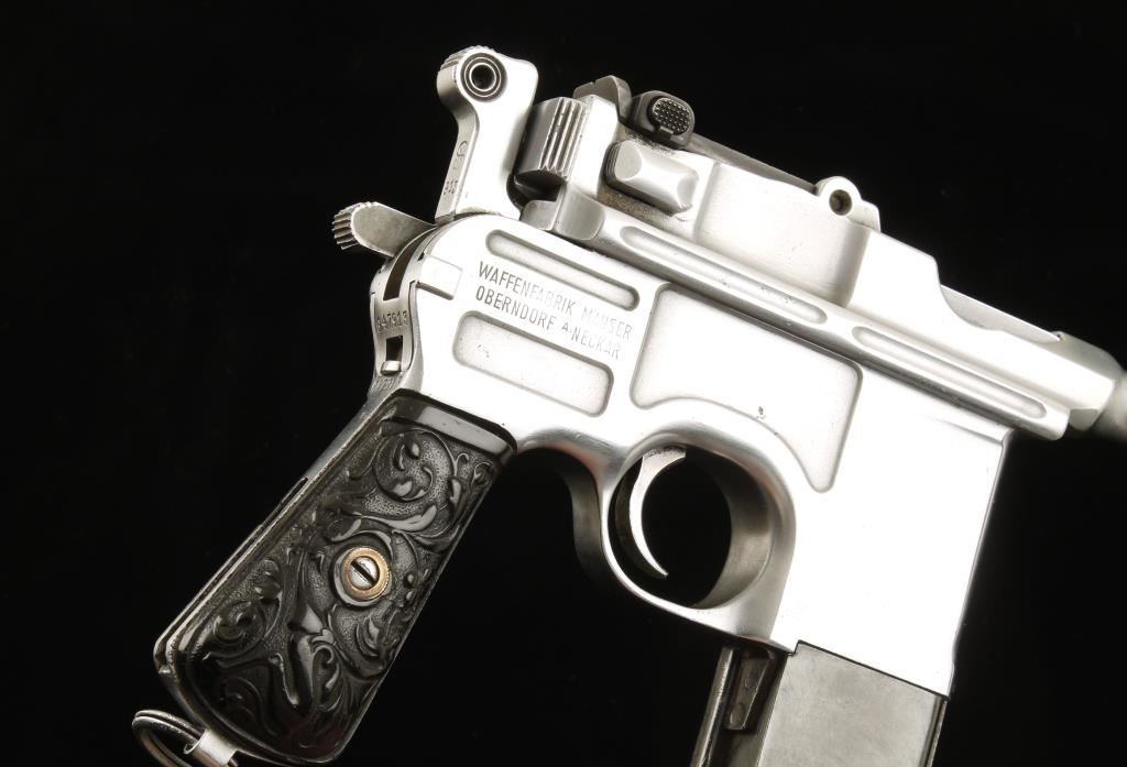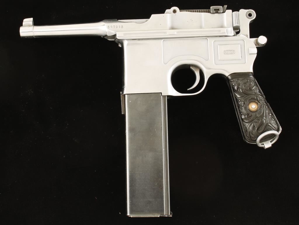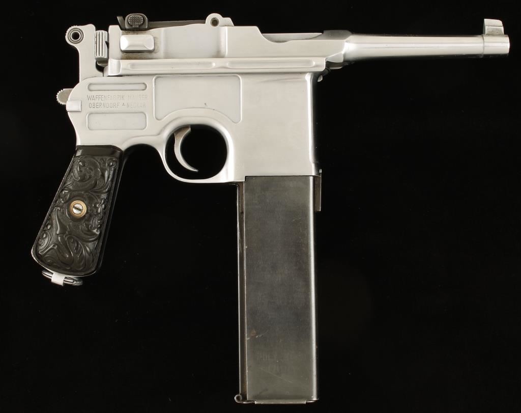 Polished in-the-white semi-automatic single-action pistol with a non-detachable magazine and a 4" barrel. All serial numbers match. The original bluing has been stripped off and the steel polished leaving a substantial amount of light pitting over all. There are some scratches in the bare metal. Most of the stampings survived the polishing. The bore is frosty with rifling. Has a blued extended magazine holding probably 30 rounds. The back strap has had a notch cut into it on the left "T"-slot. The rear sight is blued. The grip panels are ornate plastic and in good shape. Functions as it should. Condition is fair to good. *Modern Firearm*