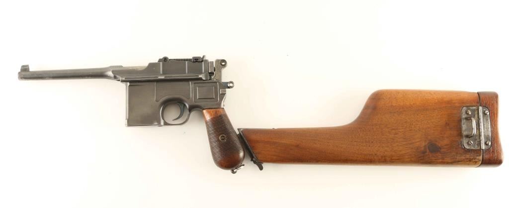 "Pre-war Commercial" German made single action semi-automatic pistol chambered in 7.63x25mm. Features a blued finish, 5.5" barrel, blade front sight, tangent rear sight graduated to 1,000 meters, smooth trigger, small ring hammer, manual safety on the rear of the grip frame with a hole through the knob, integral 10 round box magazine, steel frame with bright lanyard ring, and two-piece 33-groove walnut grips. All observed serial numbers match including the grips. Includes a wood stock/holster that bears the number "22296" on the upper tang and shows two repaired cracks on the bottom. Pistol exhibits approximately 60% of it's old professionally reblued finish showing honest wear and thinning with a very small amount of old pin prick pitting on the barrel. Action is crisp, the bore shows good luster & rifling with some scattered pitting, and the refinished wood grips are very good. Condition is near NRA Very Good as refinished. ***C&R Firearm***